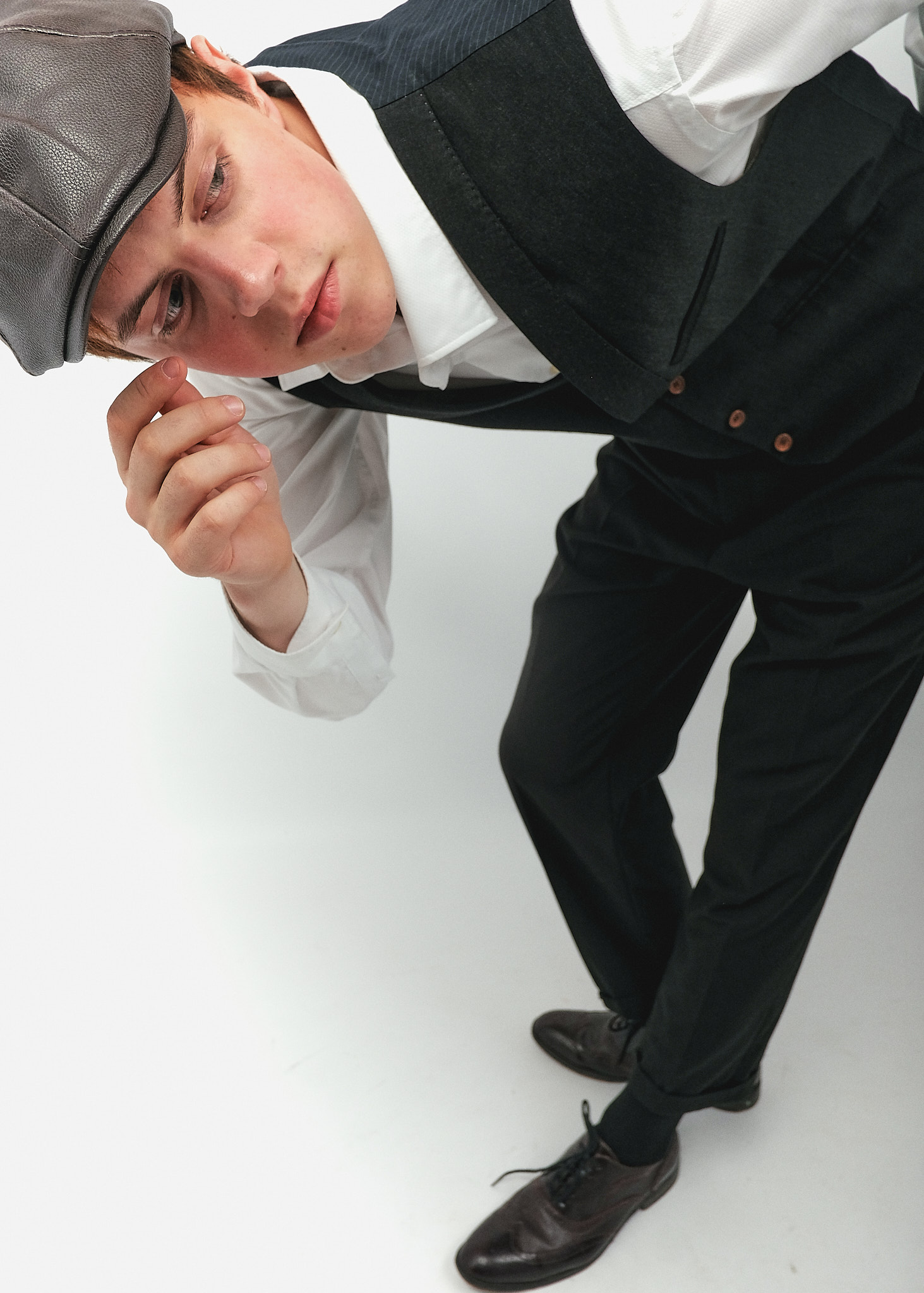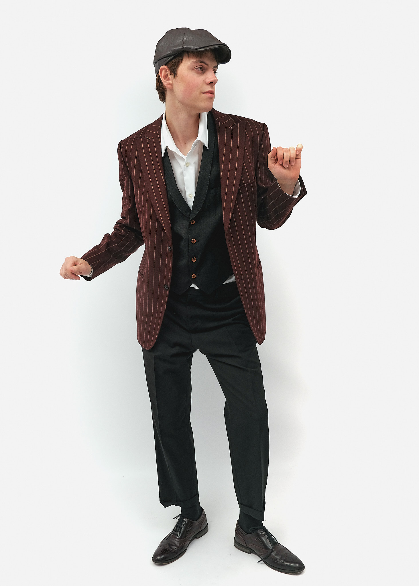 Штани: Штани вільного крою в ідентичну смужку з високою посадкою, що підкреслюють історичну достовірність чоловічої моди 1920-х.