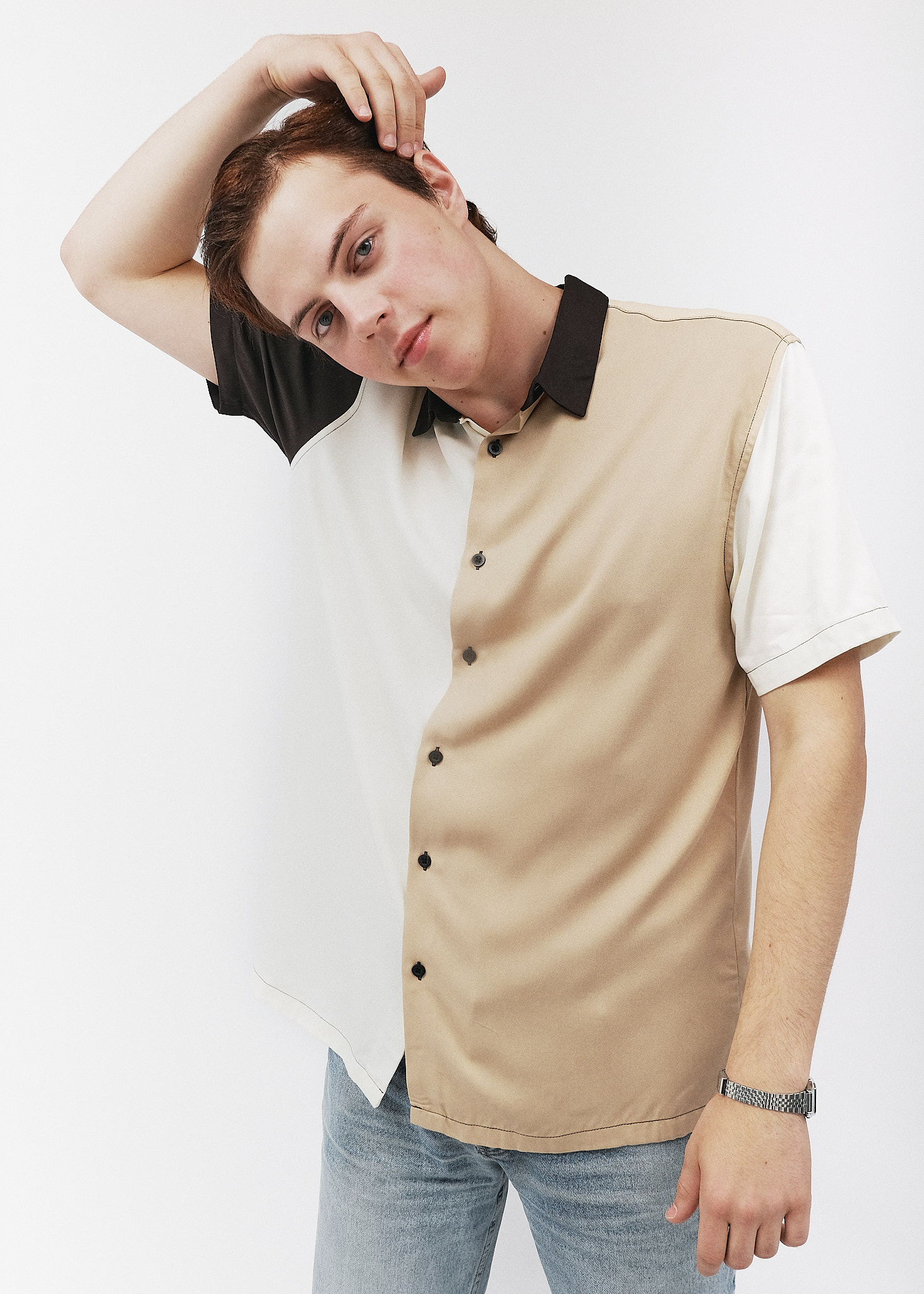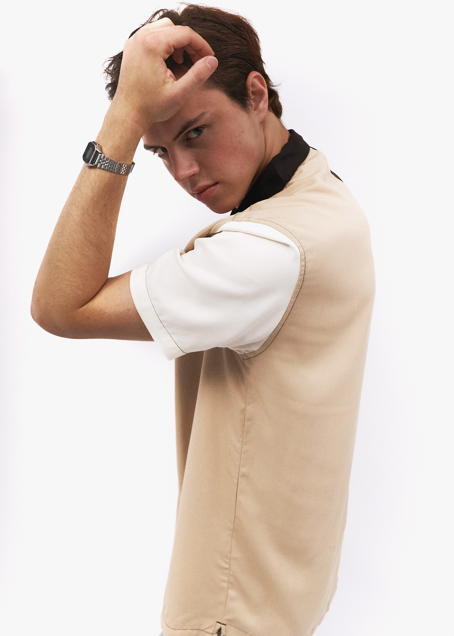 Сорочка: Триколірна сорочка з коротким рукавом та відкладним коміром. Поєднання білого, бежевого та чорного блоків створює чітку вертикальну геометрію.