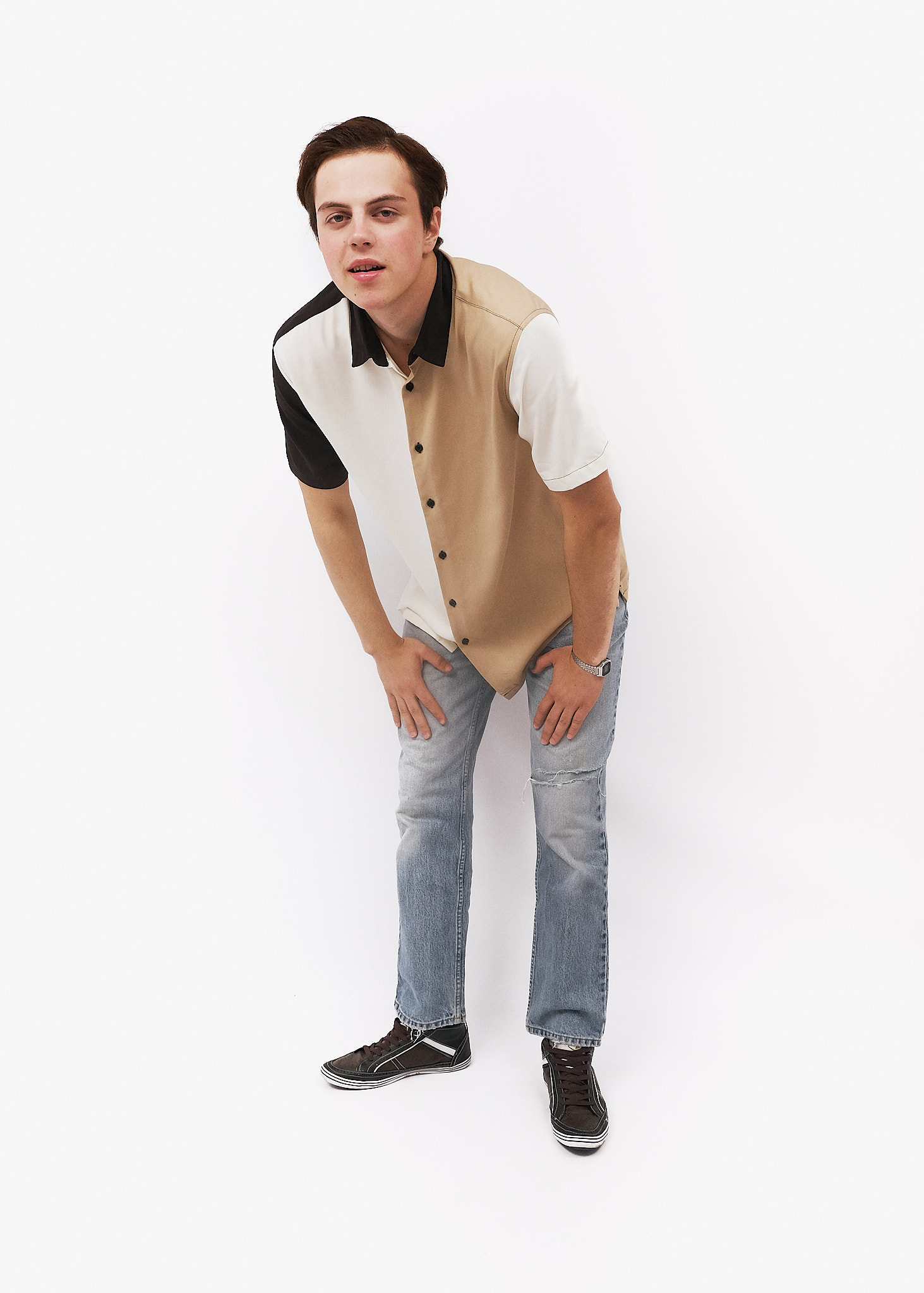 Стриманий та комфортний чоловічий образ, що базується на спокійній палітрі кольорів та прямому силуеті. Головним елементом є сорочка з популярним у 90-х дизайном «color-block», що додає візуального інтересу без зайвої яскравості. Лук виглядає як типовий аутфіт для прогулянок або неформальних зустрічей, поєднуючи в собі охайність та легкий гранжевий відтінок завдяки потертостям на джинсах.