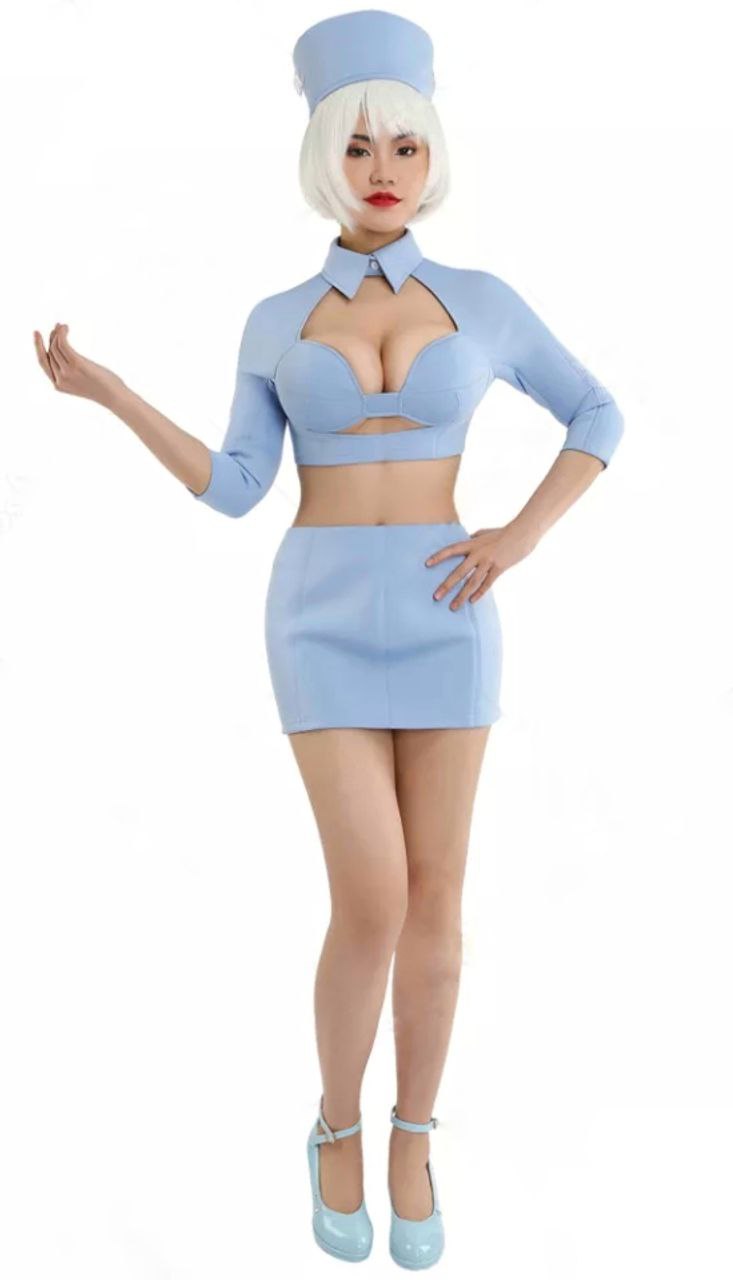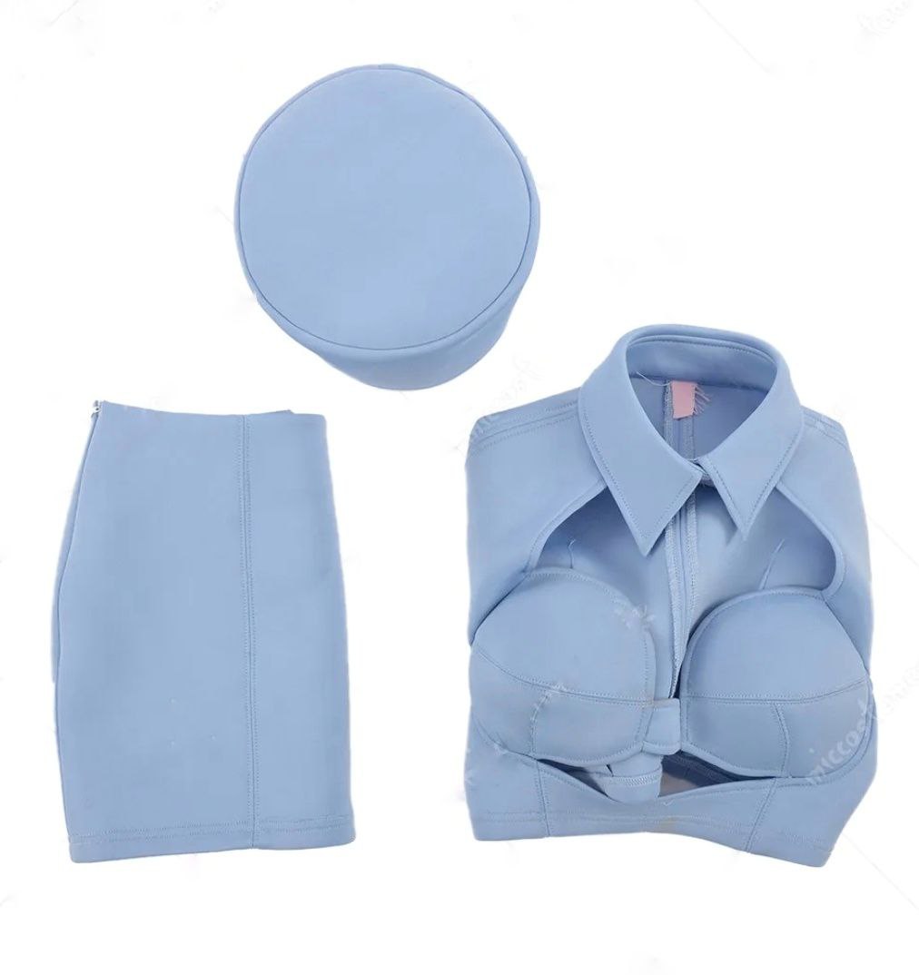 Витончений та іронічний образ, що переосмислює уніформу бортпровідниці міжгалактичних рейсів. Ніжний небесно-блакитний колір у поєднанні з жорсткими архітектурними формами створює естетику «лагідного футуризму». Цей лук поєднує в собі строгість класичного костюма з відвертими деталями та іграшковою бездоганністю, нагадуючи героїню утопічних фільмів про освоєння далеких планет.