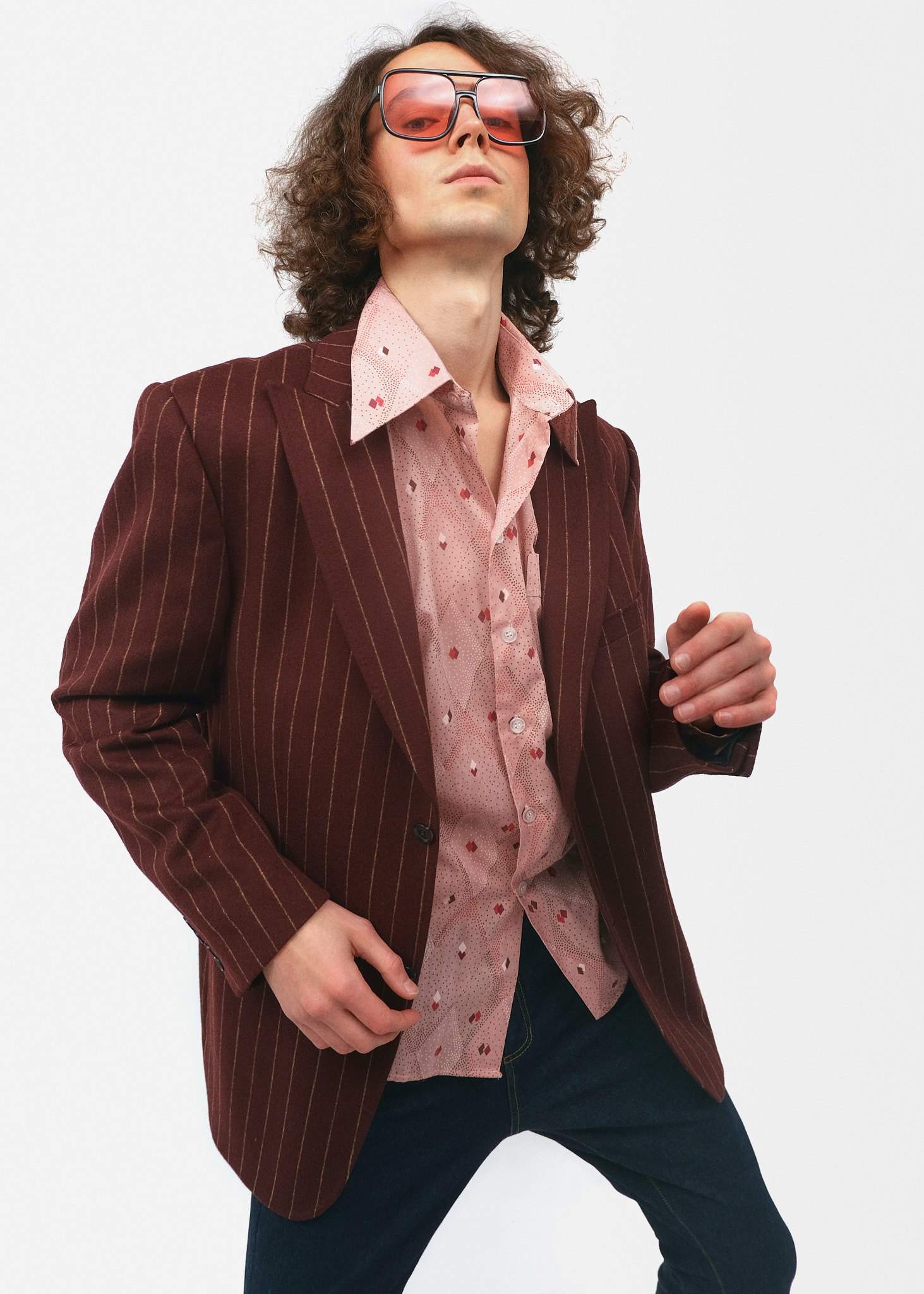 Сорочка з принтом: Рожева сорочка з дрібним червоним візерунком та характерним для епохи довгим гострим коміром, виправленим поверх лацканів піджака.