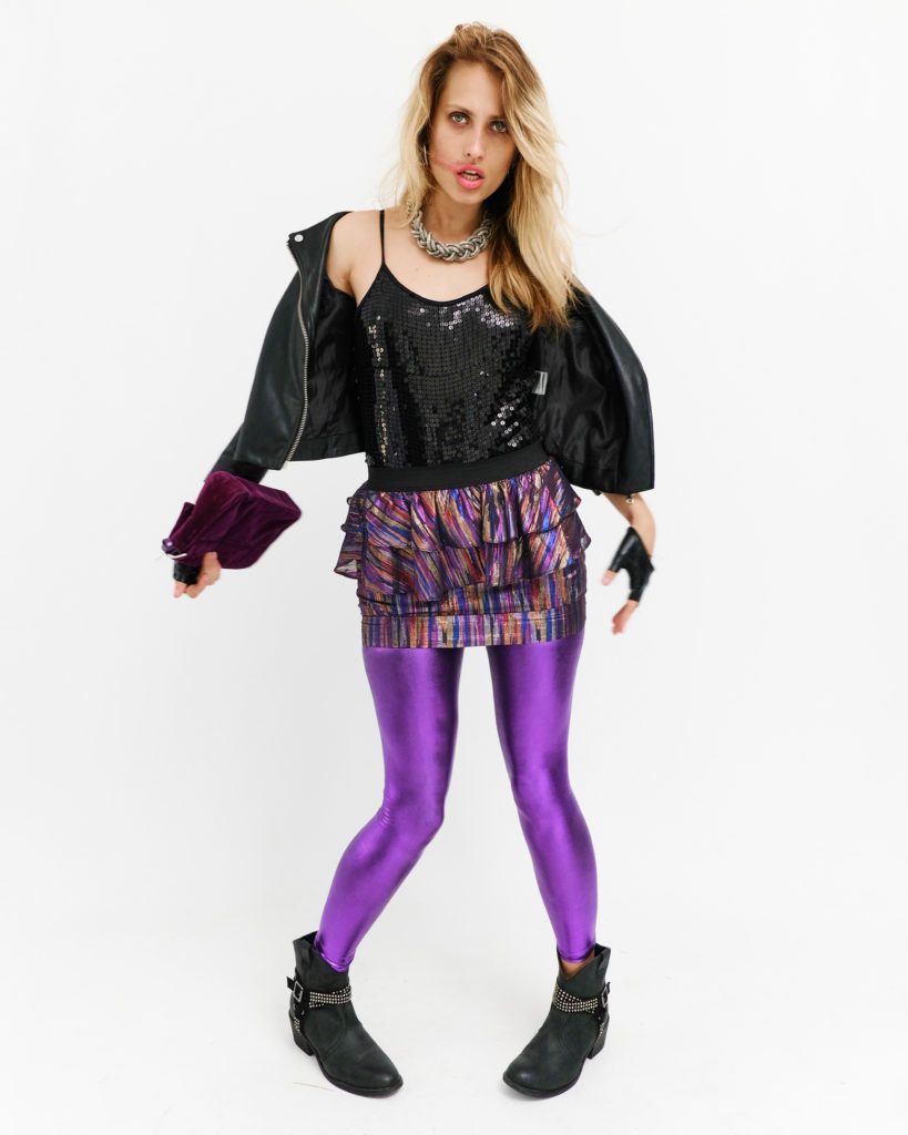 Легінси: Головний акцент — яскраві фіолетові легінси з інтенсивним глянцевим блиском (liquid leggings), які були культовою річчю тієї епохи.