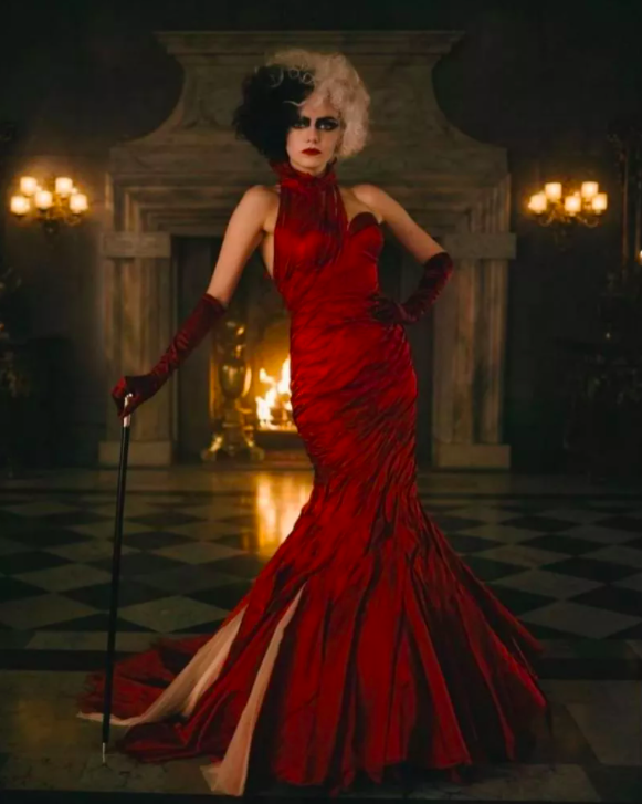 Аксесуари: Довгі вечірні рукавички в тон сукні, що додають образу аристократичної витонченості Круелли. У руках — тонка елегантна тростина, що підкреслює владний характер персонажа.