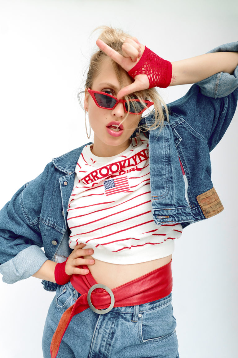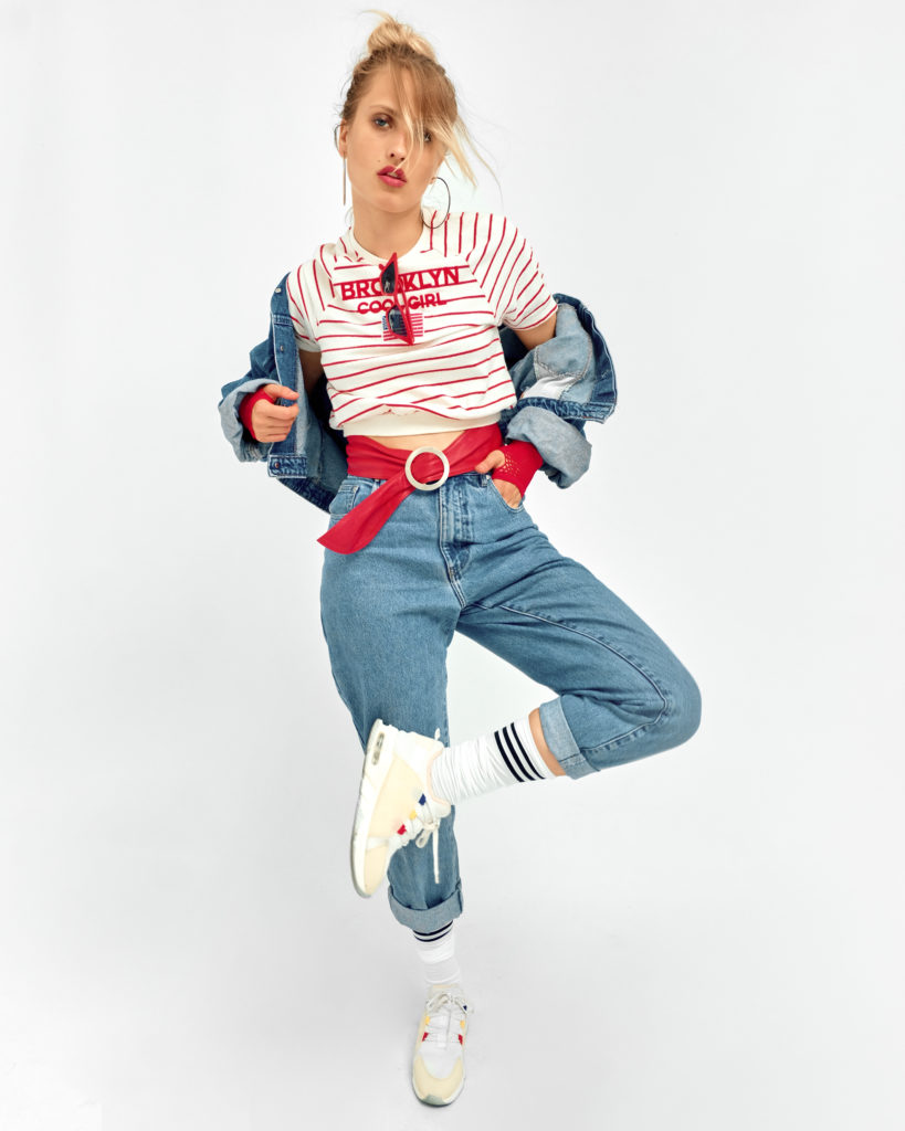 Стильний та розслаблений образ, що демонструє популярність «подвійного деніму» (denim-on-denim) у 90-х роках. Поєднання об’ємного крою з зухвалими аксесуарами червоного кольору створює настрій вуличної моди того часу — суміш гранжу та поп-культури. Підкочені рукави та штани додають луку недбалої естетики, яка була характерною для молодіжного стилю десятиліття.