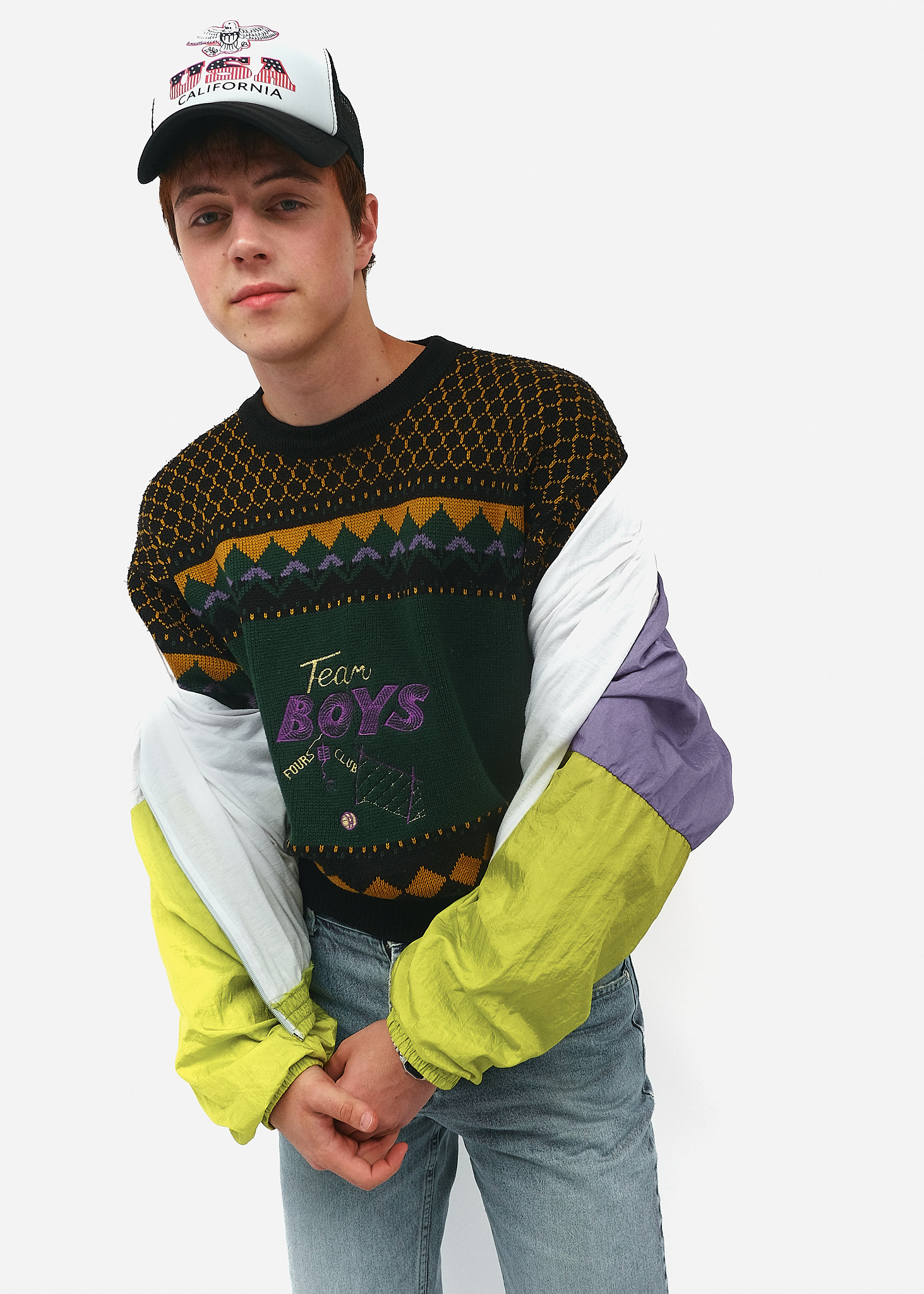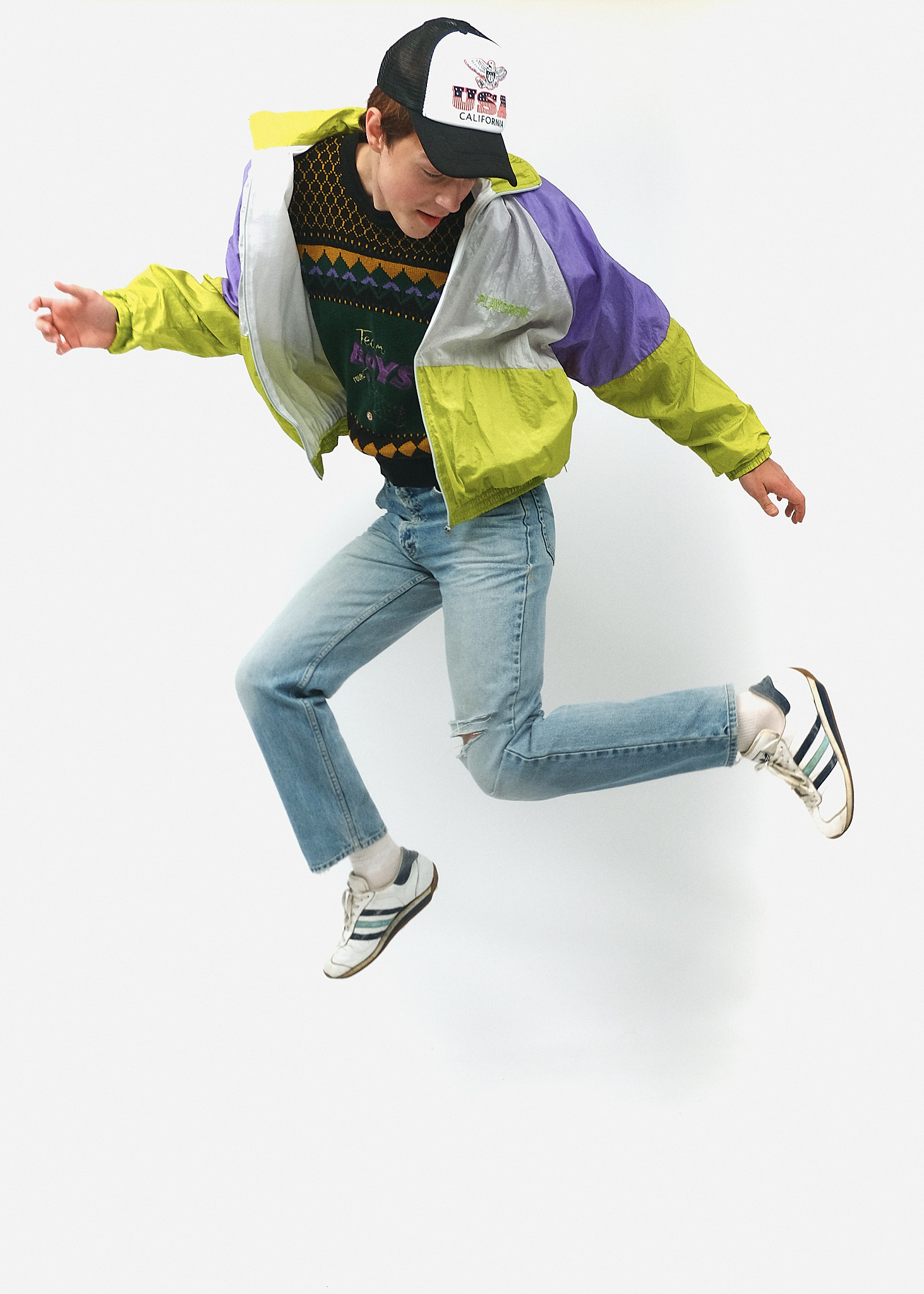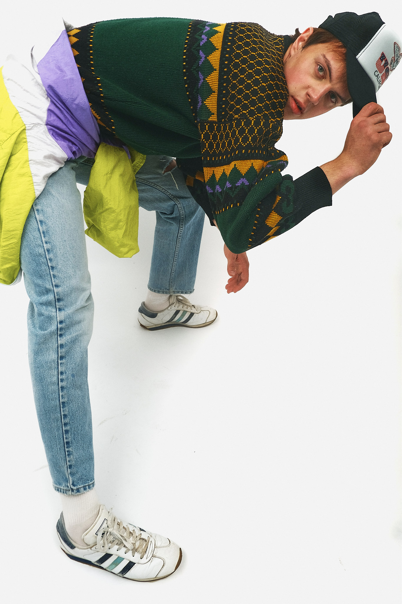Розслаблений та дещо іронічний образ, що базується на естетиці «хлопця з сусіднього під’їзду». Характерне для 90-х нашарування речей — светр з активним орнаментом поверх джинсів у поєднанні з пов'язаною на поясі вітровкою — створює впізнаваний силует. Акцент на деталях, як-от кепка та годинник на металевому браслеті, завершує цей канонічний вуличний ансамбль.