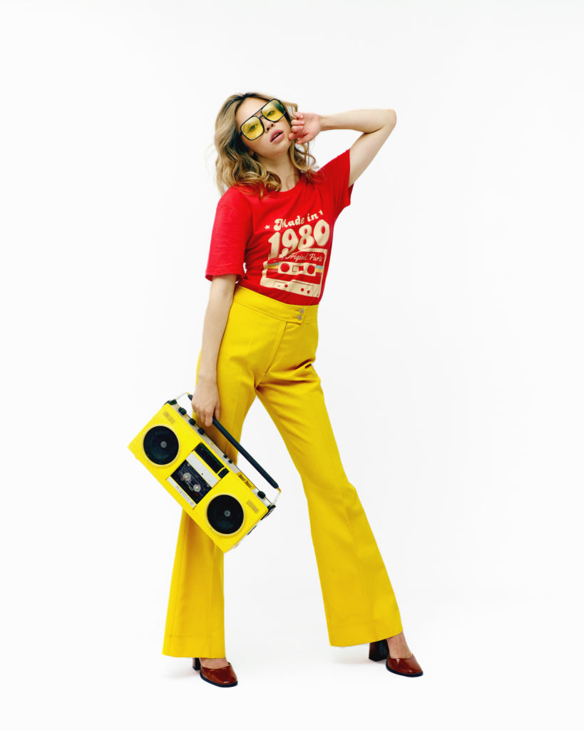 Яскравий та ексцентричний образ, побудований на сміливому поєднанні первинних кольорів — червоного та жовтого. Висока посадка штанів у поєднанні з тематичним принтом створює ностальгічний настрій, а масивні аксесуари додають луку завершеності та автентичного драйву епохи аналогового звуку.