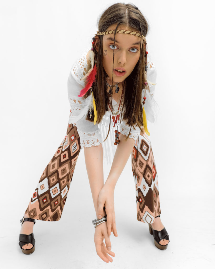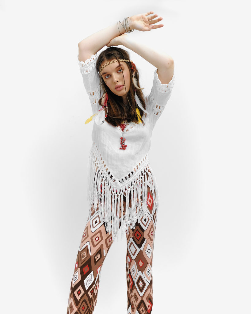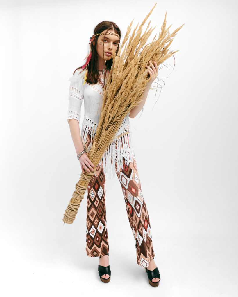 Світлий і водночас динамічний образ, що базується на контрасті чистого білого кольору та складного геометричного принту. Використання мережива та бахроми додає вбранню легкості та ефірності, тоді як чіткі ромбоподібні візерунки на штанах відсилають до психоделічної моди кінця 60-х. Образ виглядає дуже свіжо, поєднуючи в собі етнічну загадковість і сучасну витонченість.