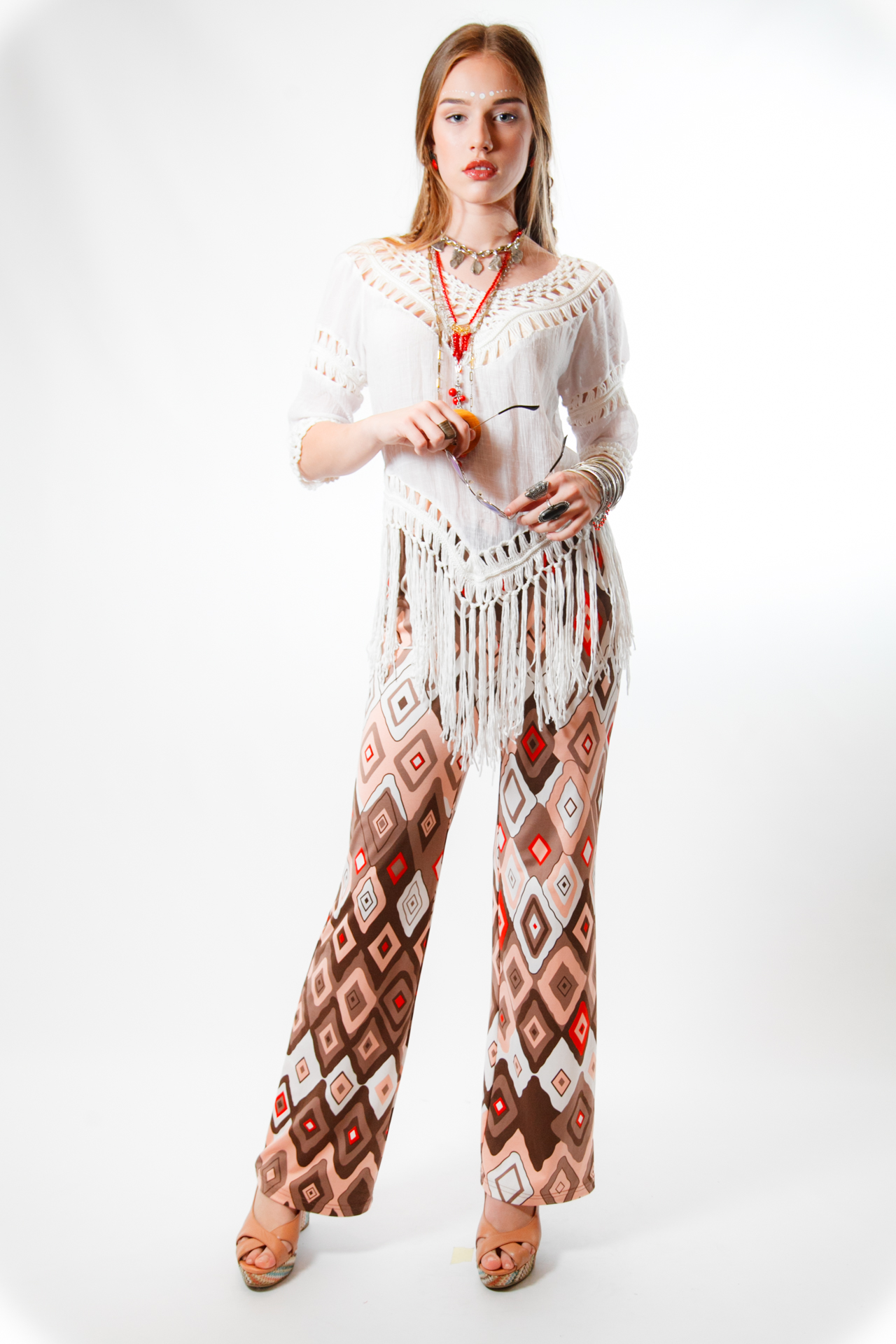 Яскравий та багатошаровий образ, що втілює дух свободи та етнічної розкоші епохи хіпі. Поєднання складних геометричних принтів із легкою текстурою бавовни та акцентними аксесуарами створює динамічний силует, ідеальний для літніх вечірок або фестивалів під відкритим небом.
