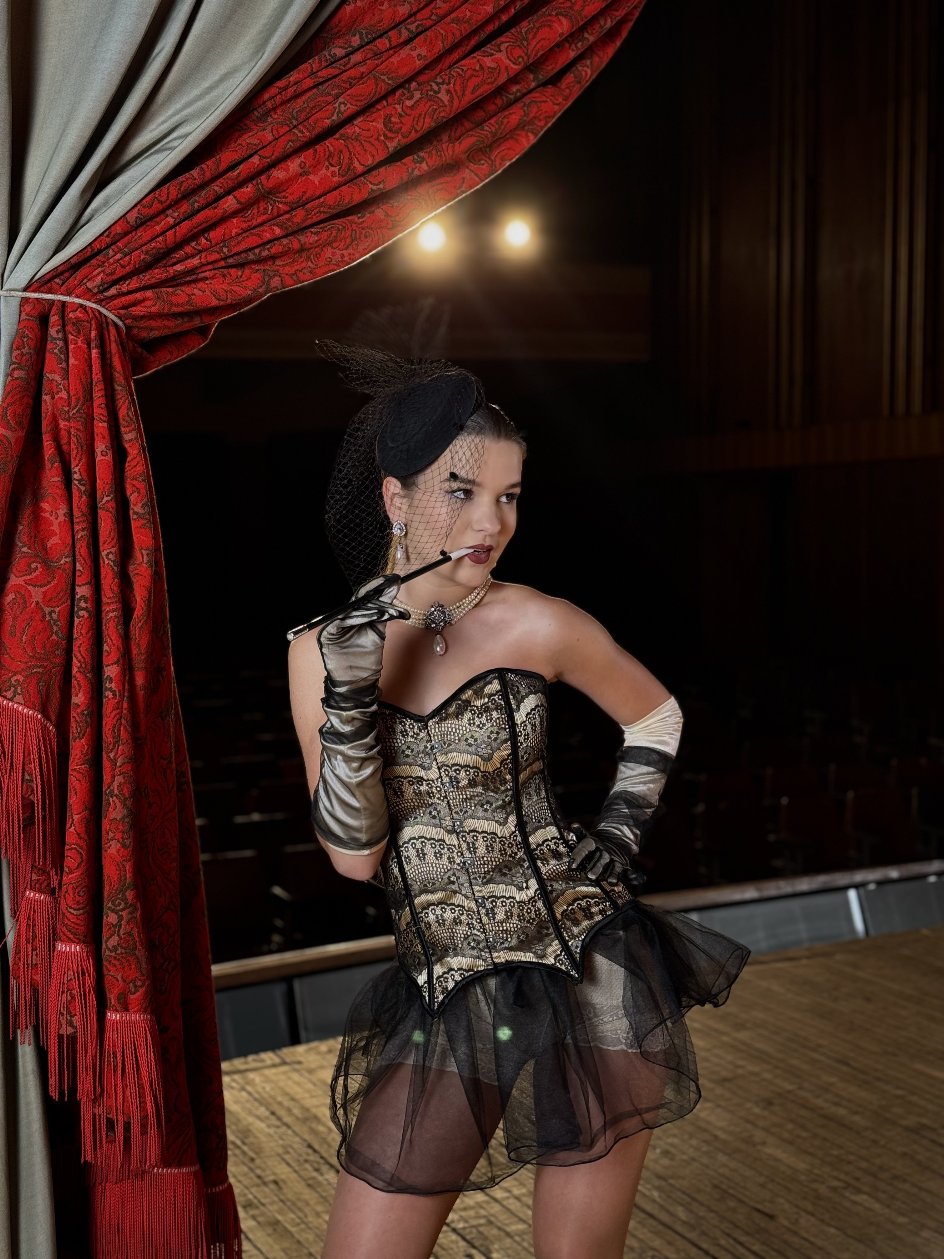 Корсет: Жорсткий корсет із гострим нижнім краєм, виконаний із парчі з золотистим візерунком та накладеним поверх тонким чорним мереживом.