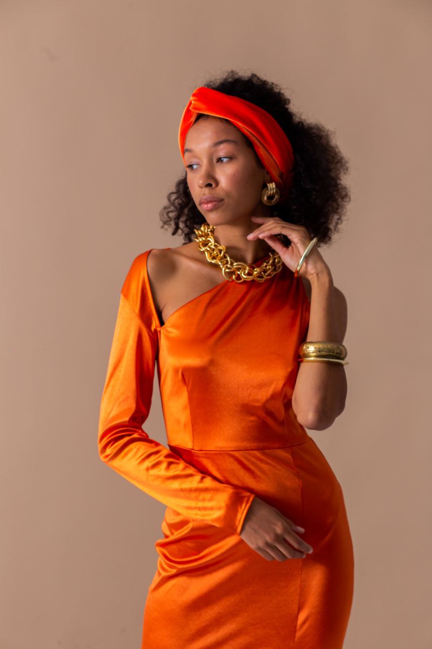Сукня: Максі-сукня з блискучого атласу глибокого гарбузового кольору. Асиметричний крій з одним довгим рукавом та відкритим плечем створює динамічний візуальний ритм, а високий розріз по нозі додає образу звабливості.