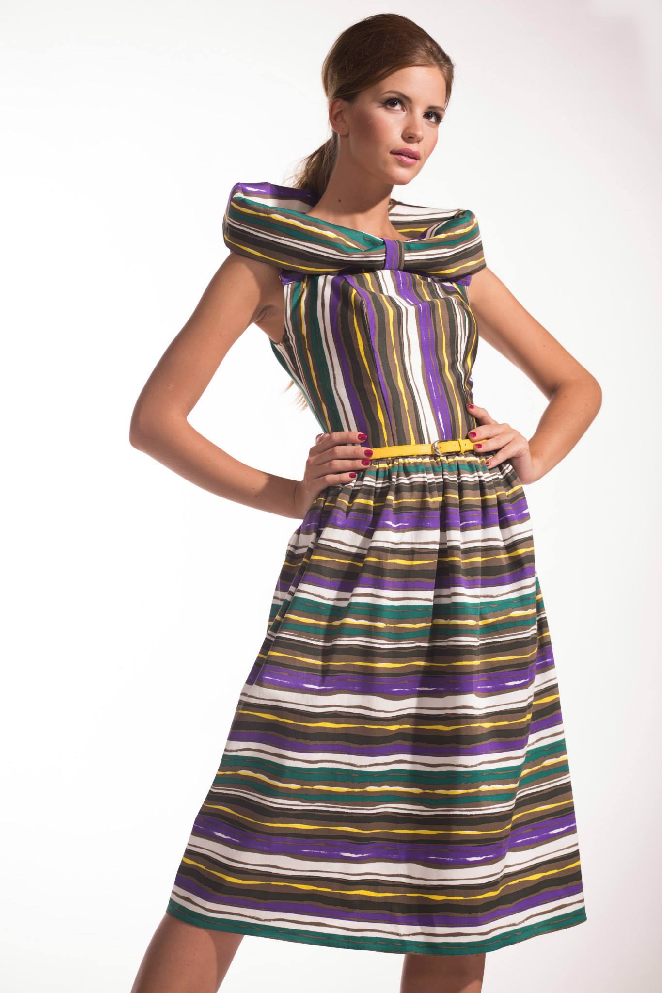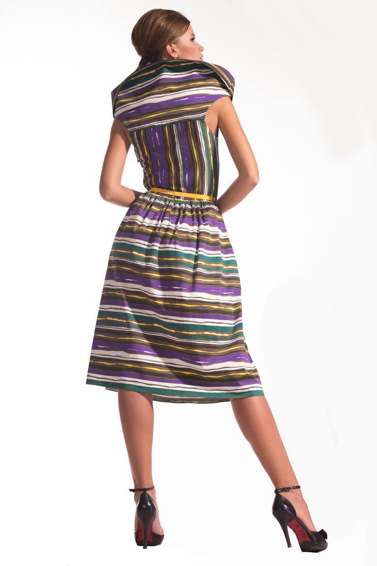 Контрастний лінійний принт: Поєднання фіолетових, смарагдових та охристих смуг у стилі «акварельної графіки». Різноспрямованість ліній на ліфі та спідниці створює цікаву візуальну гру, що виділяє власницю з натовпу.