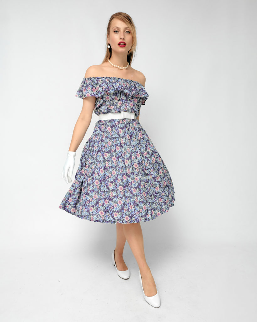 Романтичний та витончений образ, що втілює естетику «заміського клубу» середини минулого століття. Поєднання відкритої лінії плечей з дрібним квітковим принтом створює образ тендітної, але впевненої в собі леді, ідеально підходячи для літніх урочистостей або вечірніх прийомів у саду.