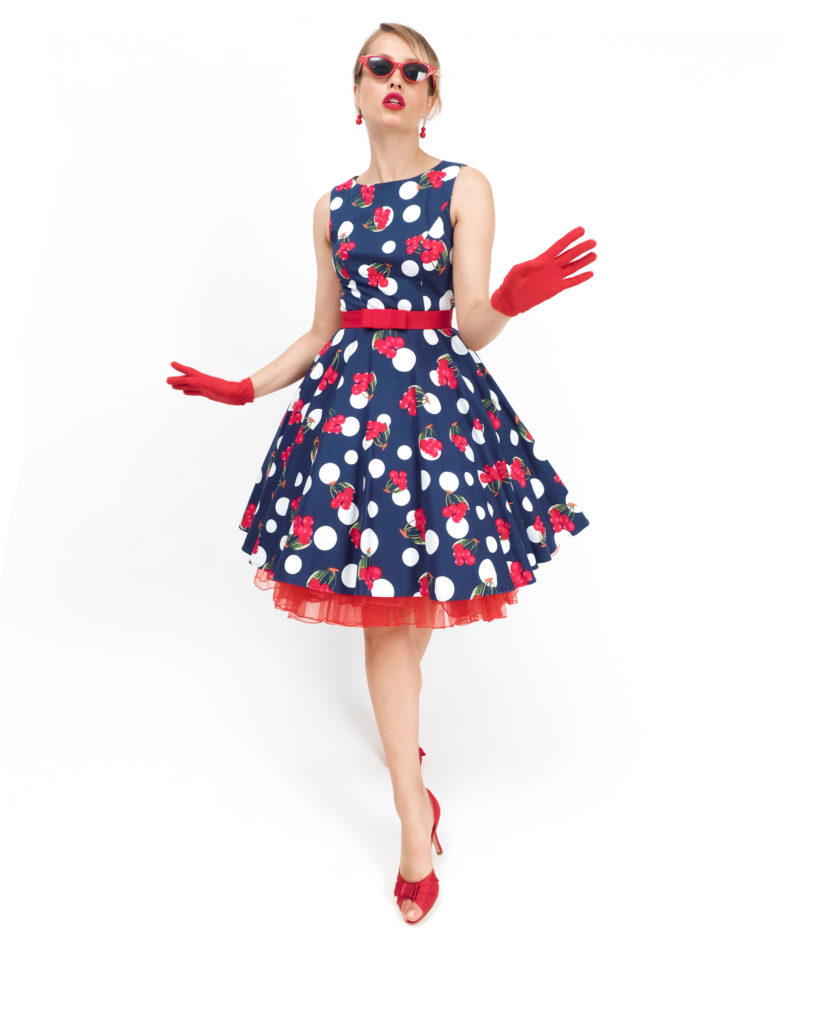Сукня: Приталена сукня без рукавів темно-синього кольору. Принт поєднує великий білий горох та яскраві грона стиглих вишень. Спідниця фасону «сонце» створює класичний силует «пісочний годинник».