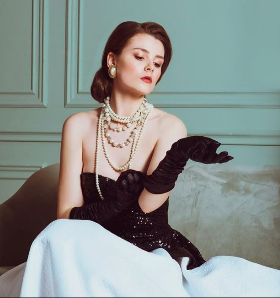 Прикраси: Багатошарове намисто з перлин різного діаметру та масивні сережки-кліпси у ретро-стилі.