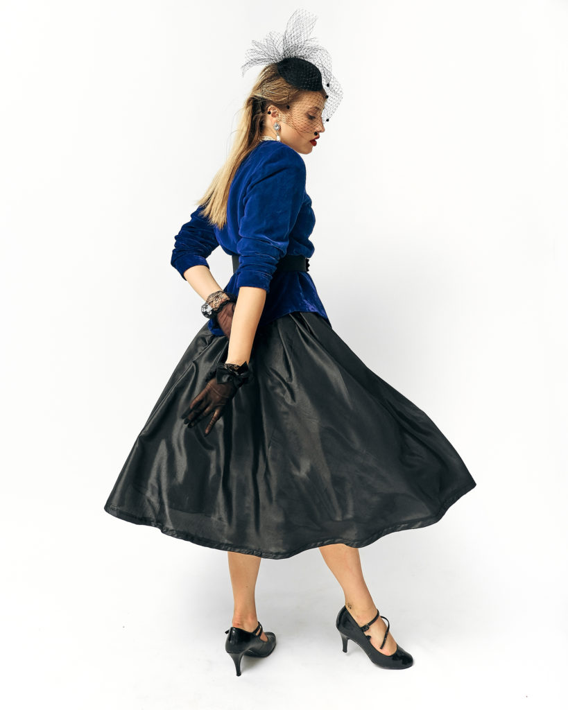 Глибокий та загадковий образ, що втілює вечірню розкіш та високу драму епохи "New Look". Контраст між королівським синім оксамитом та глянцевим чорним сатином створює багату візуальну текстуру, а театральні аксесуари перетворюють цей лук на вбрання для великої сцени або світського рауту.