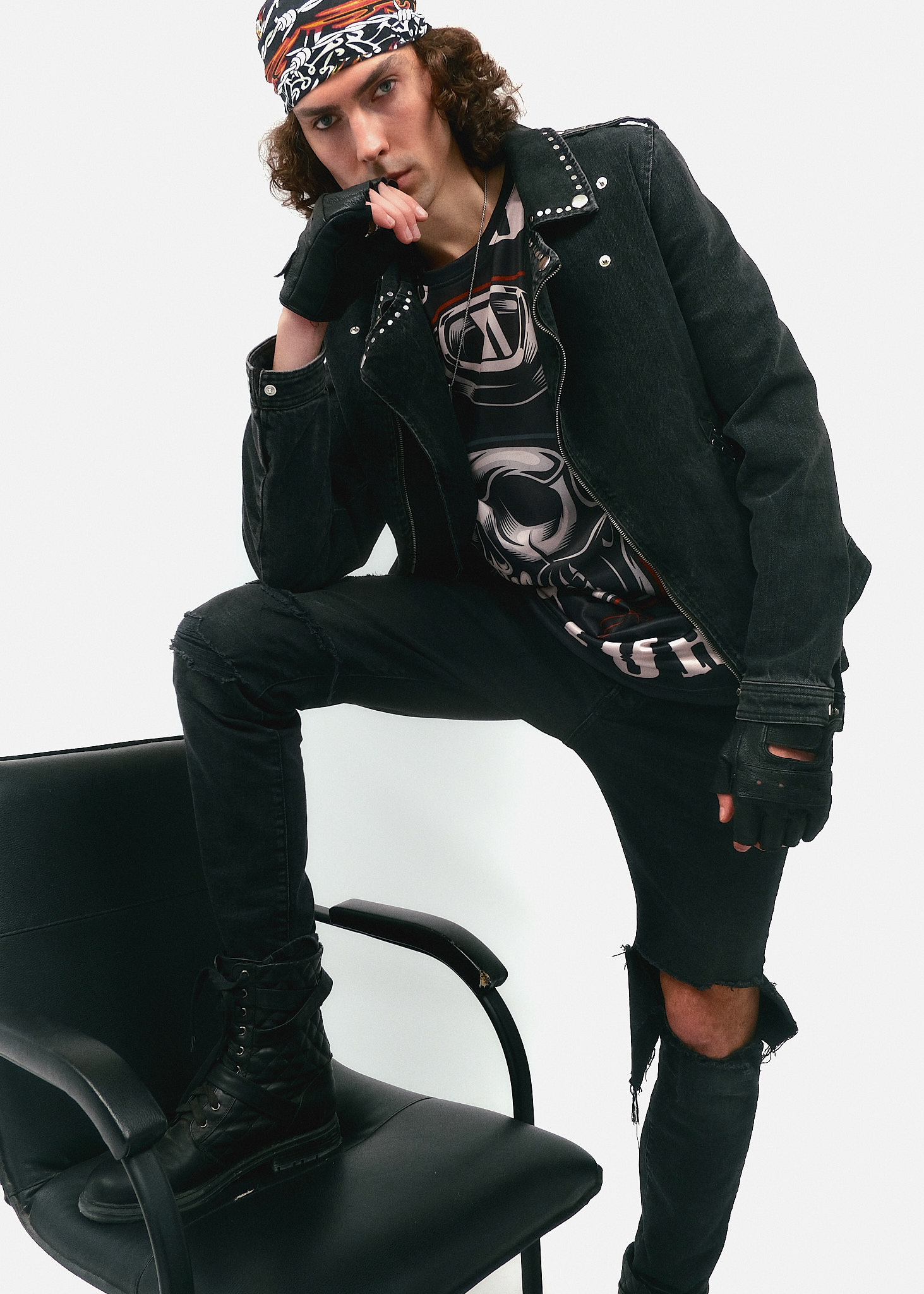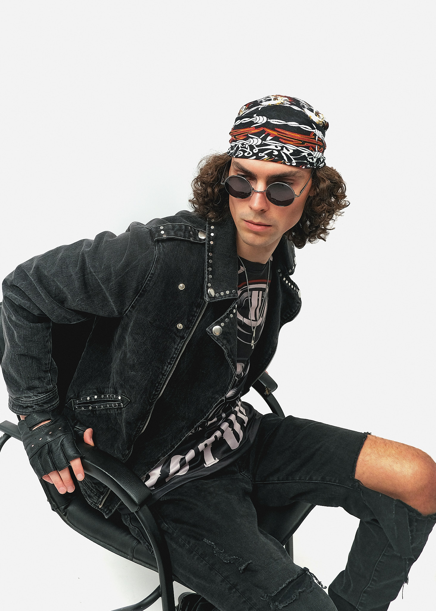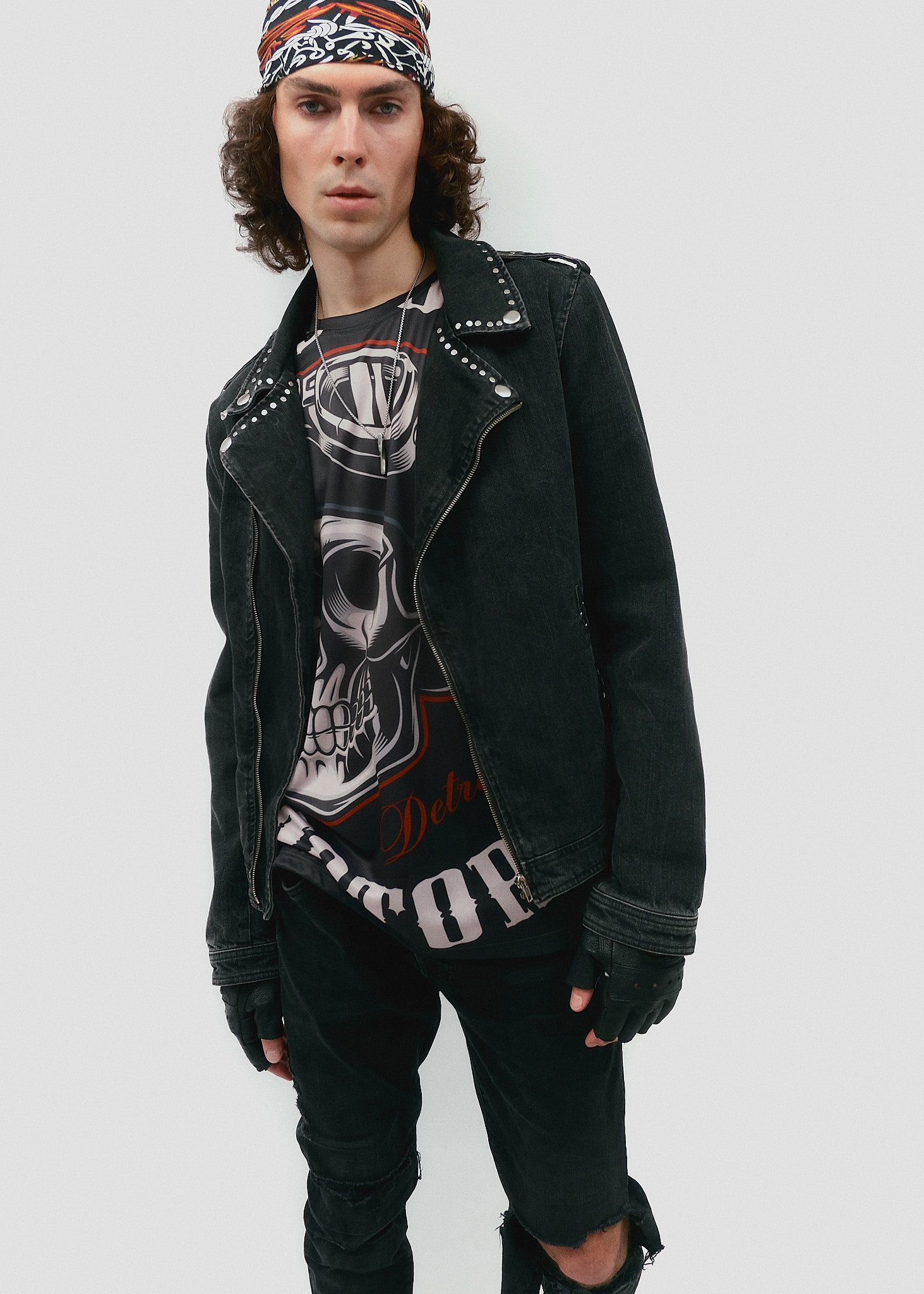 Джинсова куртка-косуха: Виконана з цупкого чорного деніму з ефектом легкого виварювання. Класичний крій косухи з широкими лацканами, декорованими металевими заклепками по краях, додає образу автентичної важкості.