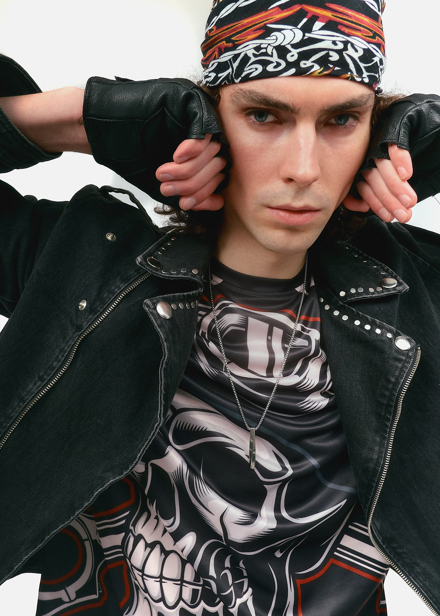 Футболка з графічним принтом: Велике монохромне зображення черепа на грудях є традиційним символом рок-культури. Подовжений крій футболки створює багатошаровість, що виглядає з-під куртки.