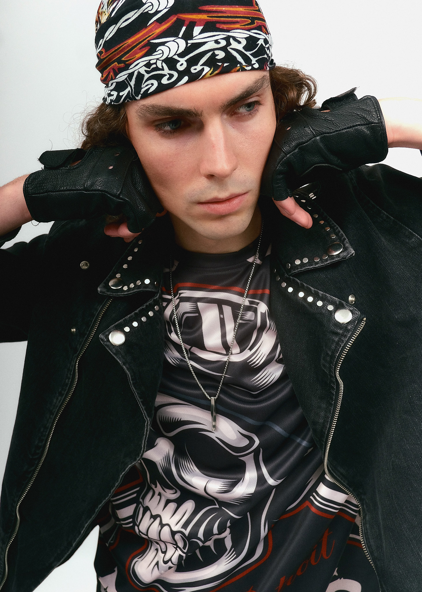 Бандана: Пов’язана на голову бандана з контрастним візерунком — практичний та стильний елемент, що відсилає до золотої ери хард-року та завершує портретну зону.