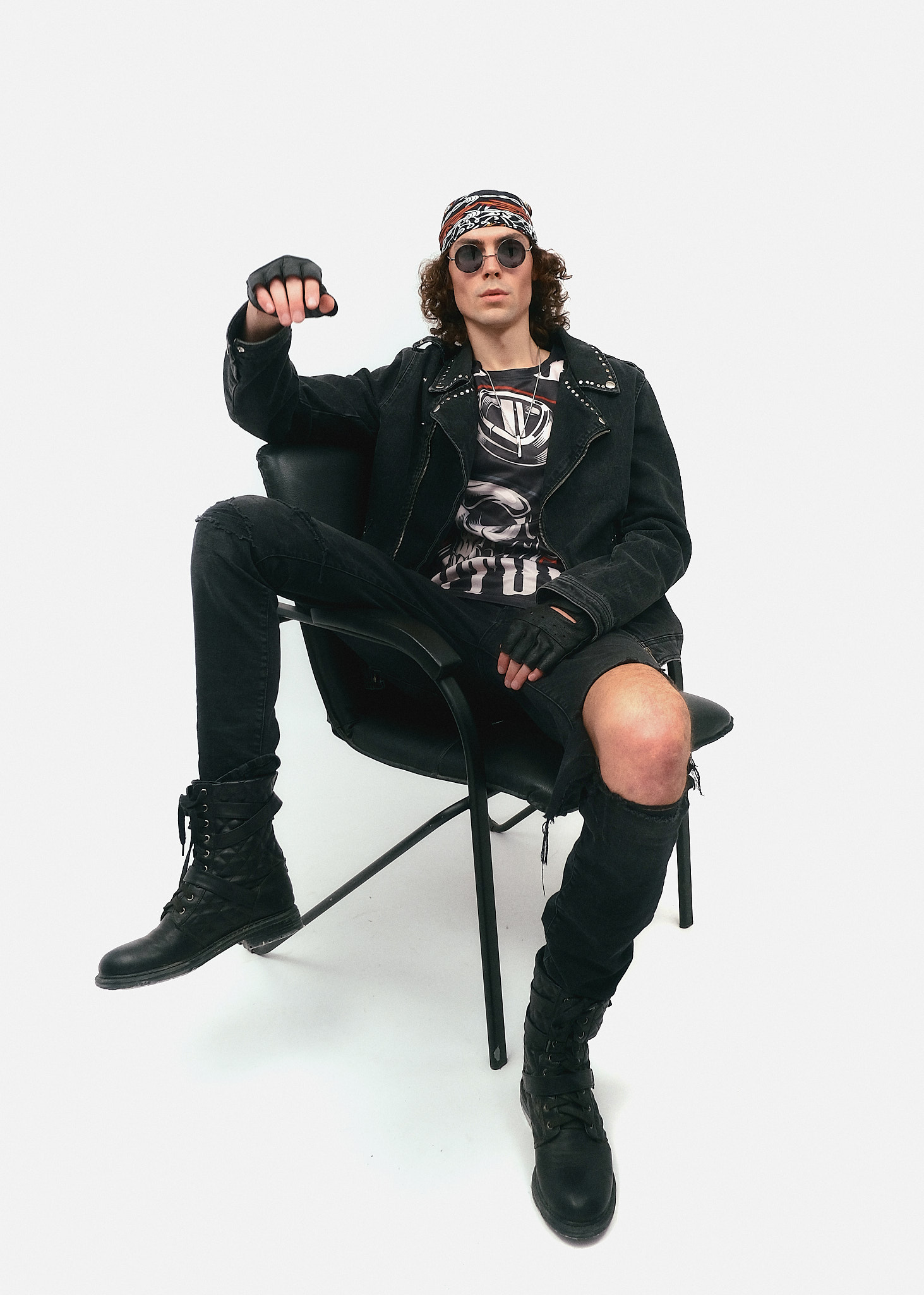 Суворий та водночас деталізований образ, що втілює дух нічних доріг та олдскульного металу. Лук побудований на грі відтінків чорного та сірого, де центральне місце займає виразна графіка. Це класичне поєднання деніму та шкіри, переосмислене через призму сучасної вуличної моди. Такий вибір ідеально підходить для тих, хто віддає перевагу перевіреній часом рок-естетиці з акцентом на брутальні аксесуари та візуальну цілісність.