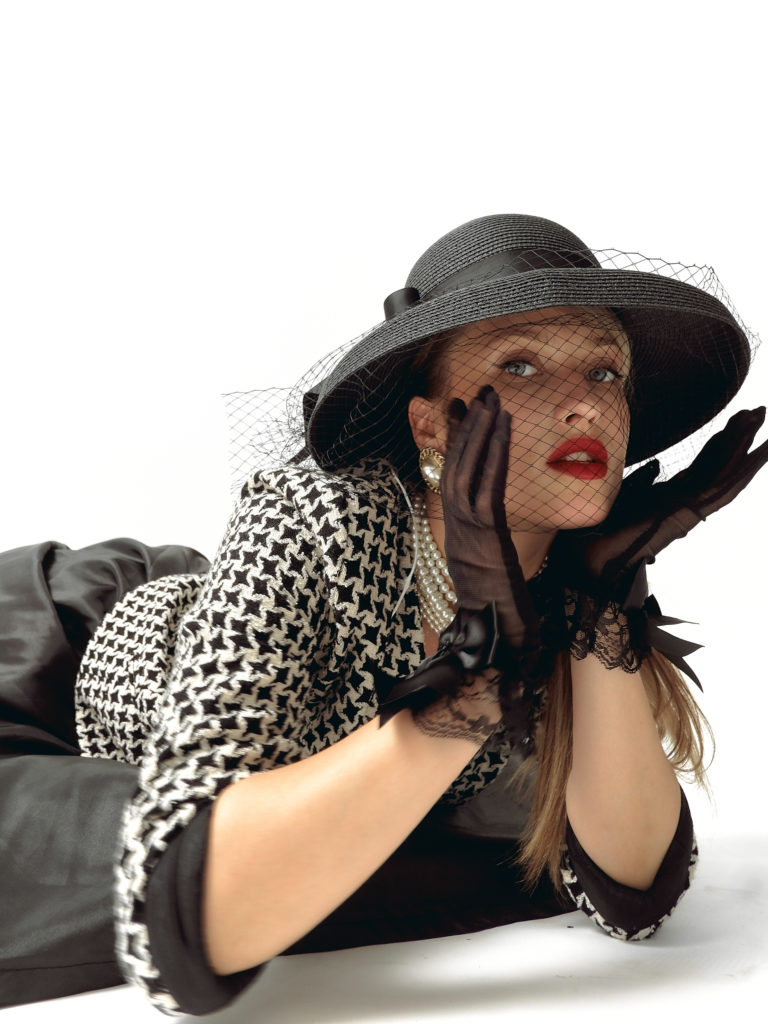 Високохудожній та драматичний образ, що базується на суворій чорно-білій палітрі. Він ідеально передає атмосферу "золотої ери" Голлівуду, де кожен елемент працює на створення образу загадкової та недосяжної діви. Гра текстур — від щільного твіду до невагомого фатину та блиску перлів — робить цей монохромний лук неймовірно глибоким та статусним.