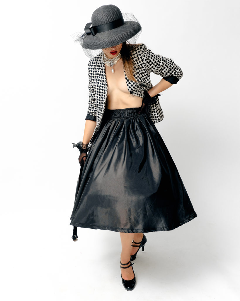 Капелюх: Елегантний чорний капелюх із широкими крисами, доповнений витонченою вуаллю-сіткою, що додає образу таємничості та театрального шарму.