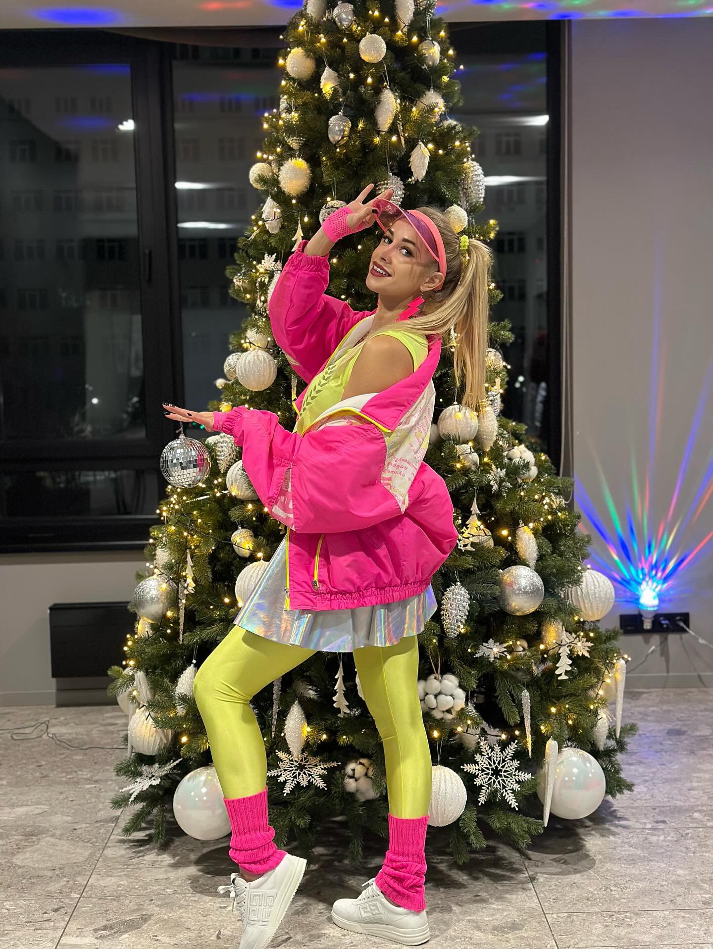 Екстравагантний та гіперактивний образ, що поєднує спортивний стиль 80-х із неоновою естетикою вечірок 90-х. Використання кислотних кольорів, світловідбивних матеріалів та характерного пластикового декору створює образ "королеви дискотеки" або інструкторки з аеробіки того часу. Лук випромінює позитив, зухвалість та готовність до нескінченних танців.