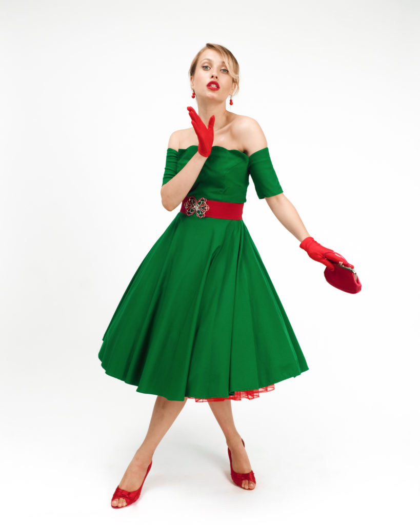 Яскравий та енергійний образ у стилі "pin-up", що майстерно грає на контрасті насиченого зеленого та глибокого червоного кольорів. Ансамбль випромінює святковий настрій та динаміку, відсилаючи до золотої ери жіночності середини XX століття.