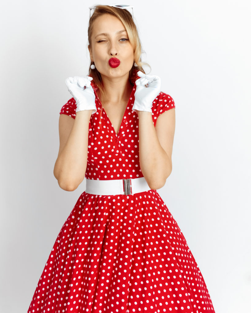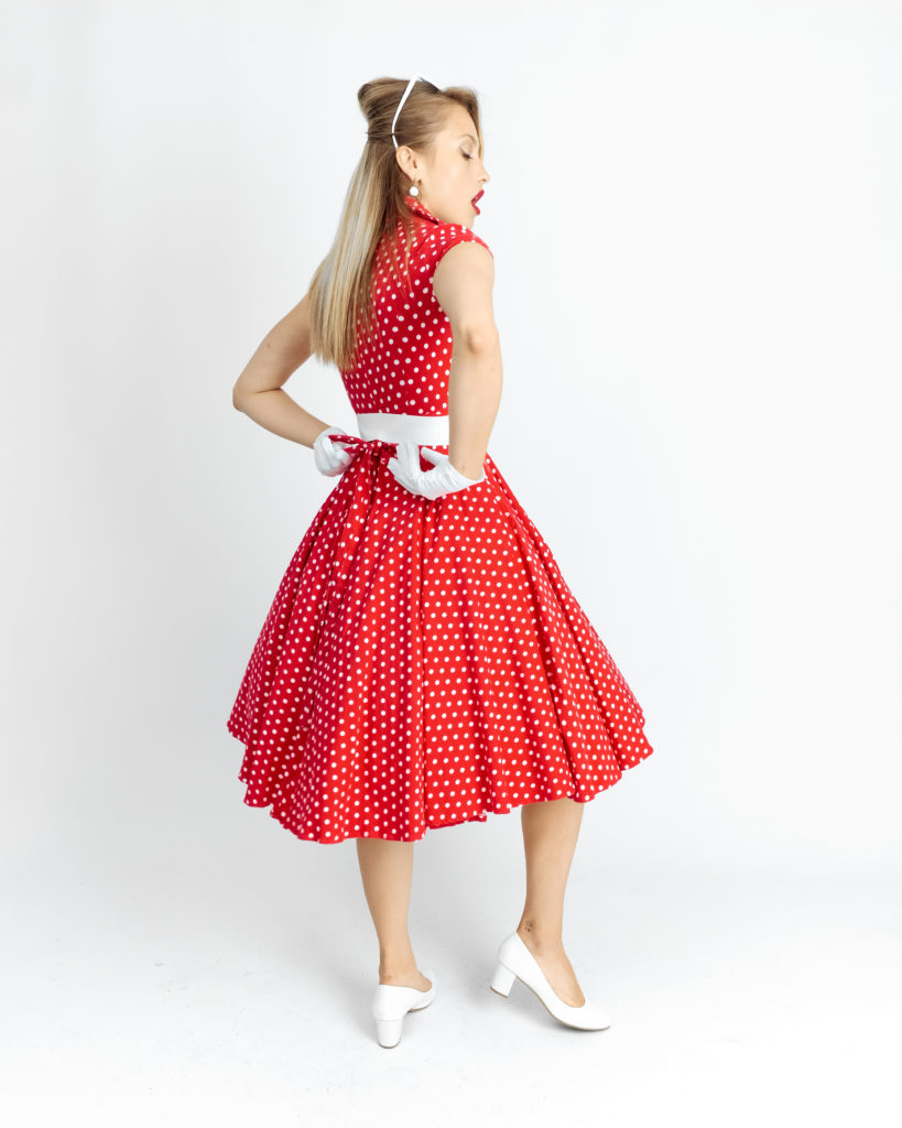 Енергійний та пристрасний образ, що став справжнім символом епохи пін-апу. Поєднання яскраво-червоного кольору з білим принтом "polka dot" створює іскристий візуальний ефект, який найкраще розкривається в русі, підкреслюючи життєрадісність та драйв стилю 1950-х років.