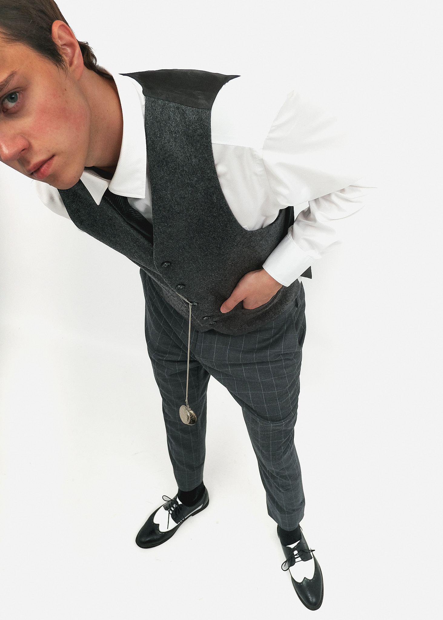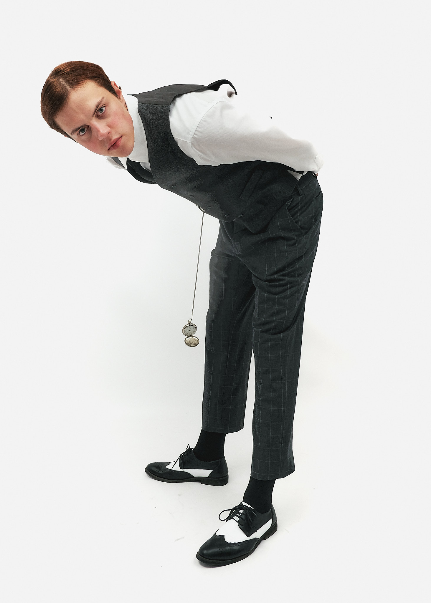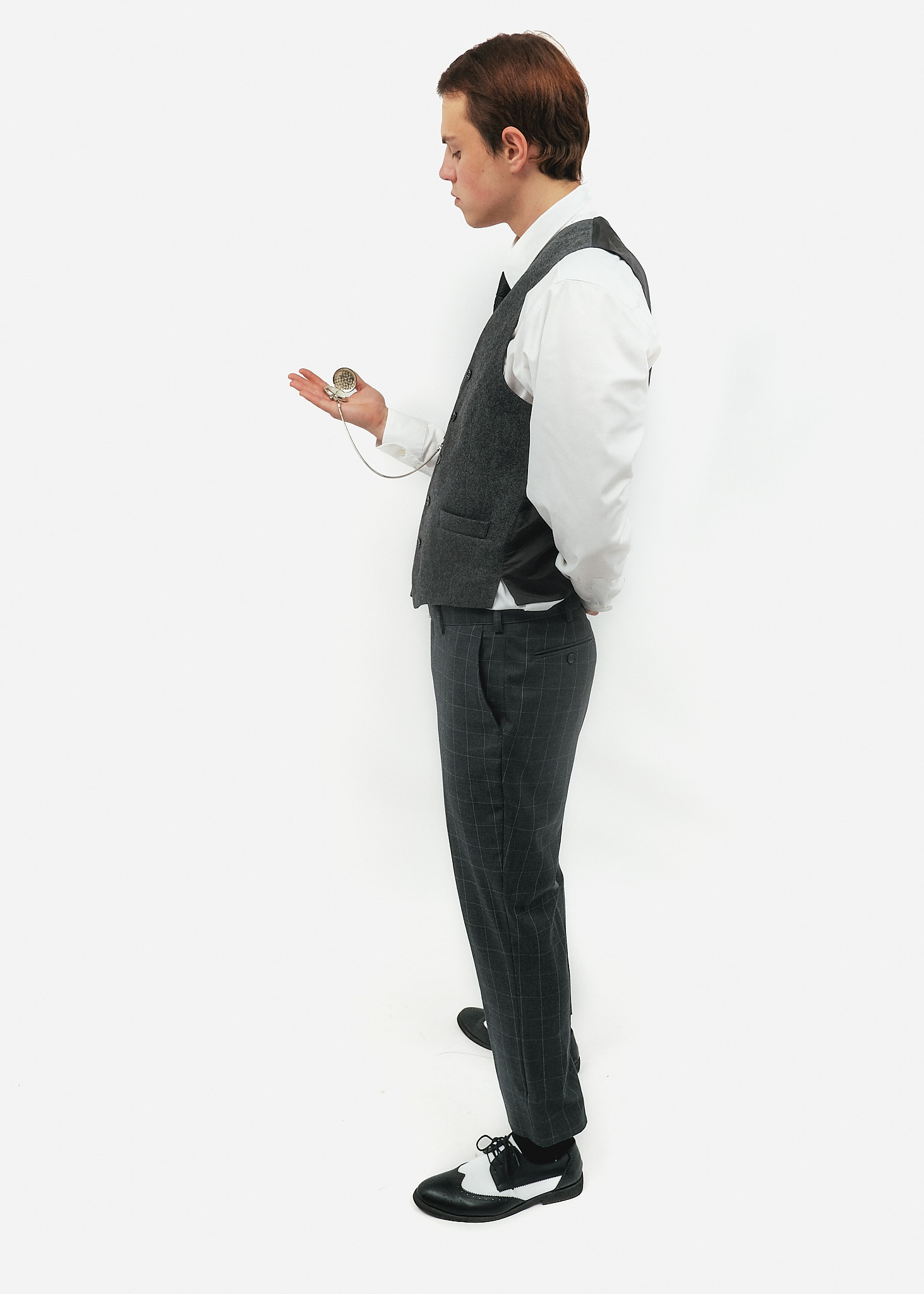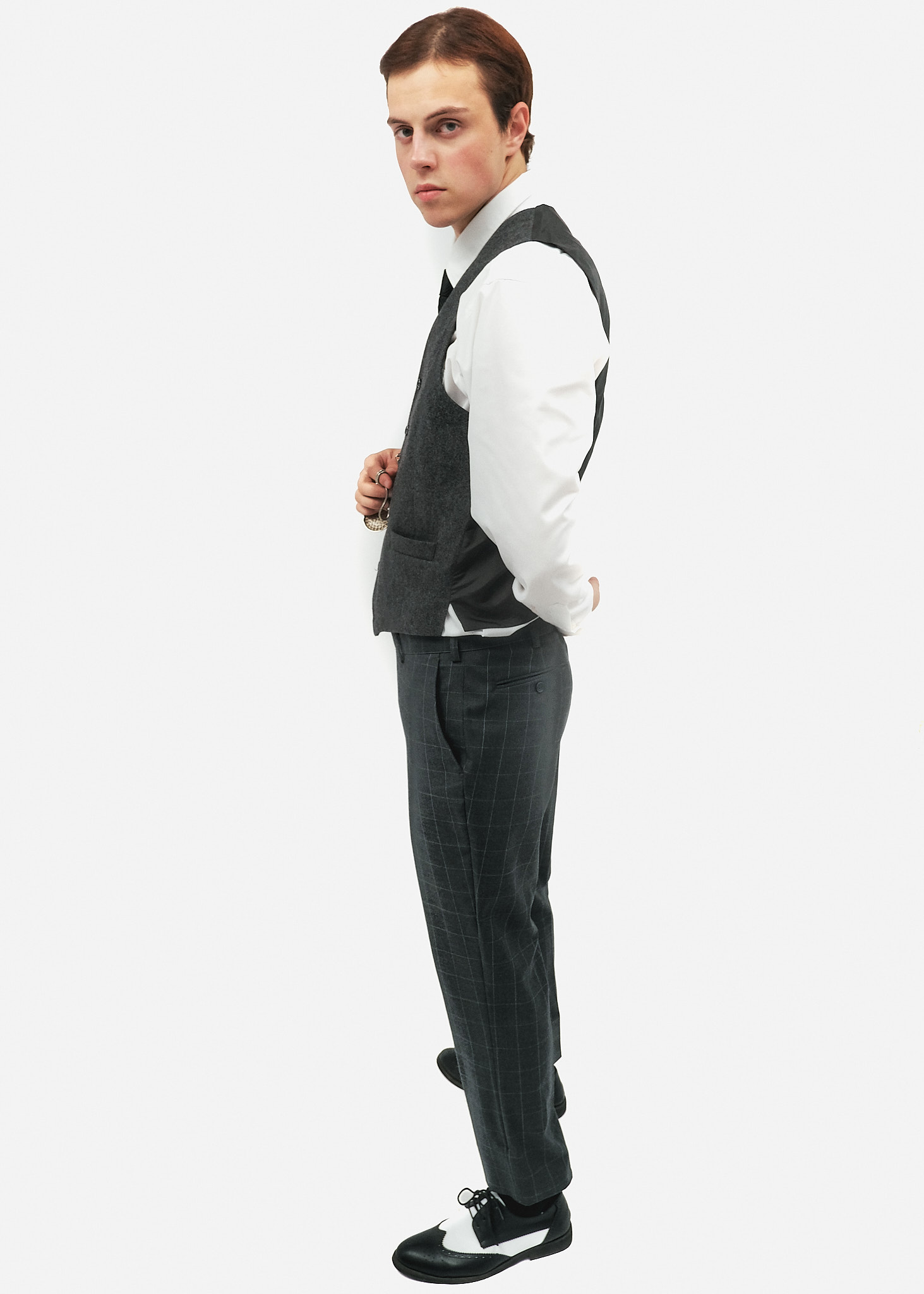 Взуття: Двоколірні чорно-білі броги (spectator shoes) з характерною перфорацією. Це знакове взуття епохи джазу, що робить образ максимально впізнаваним.