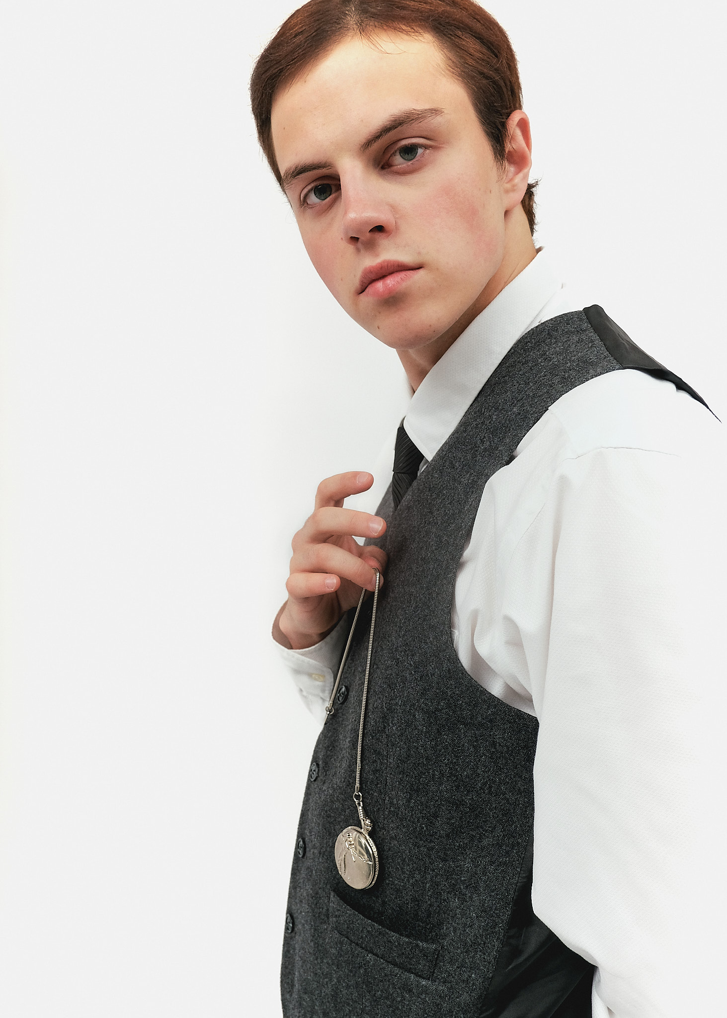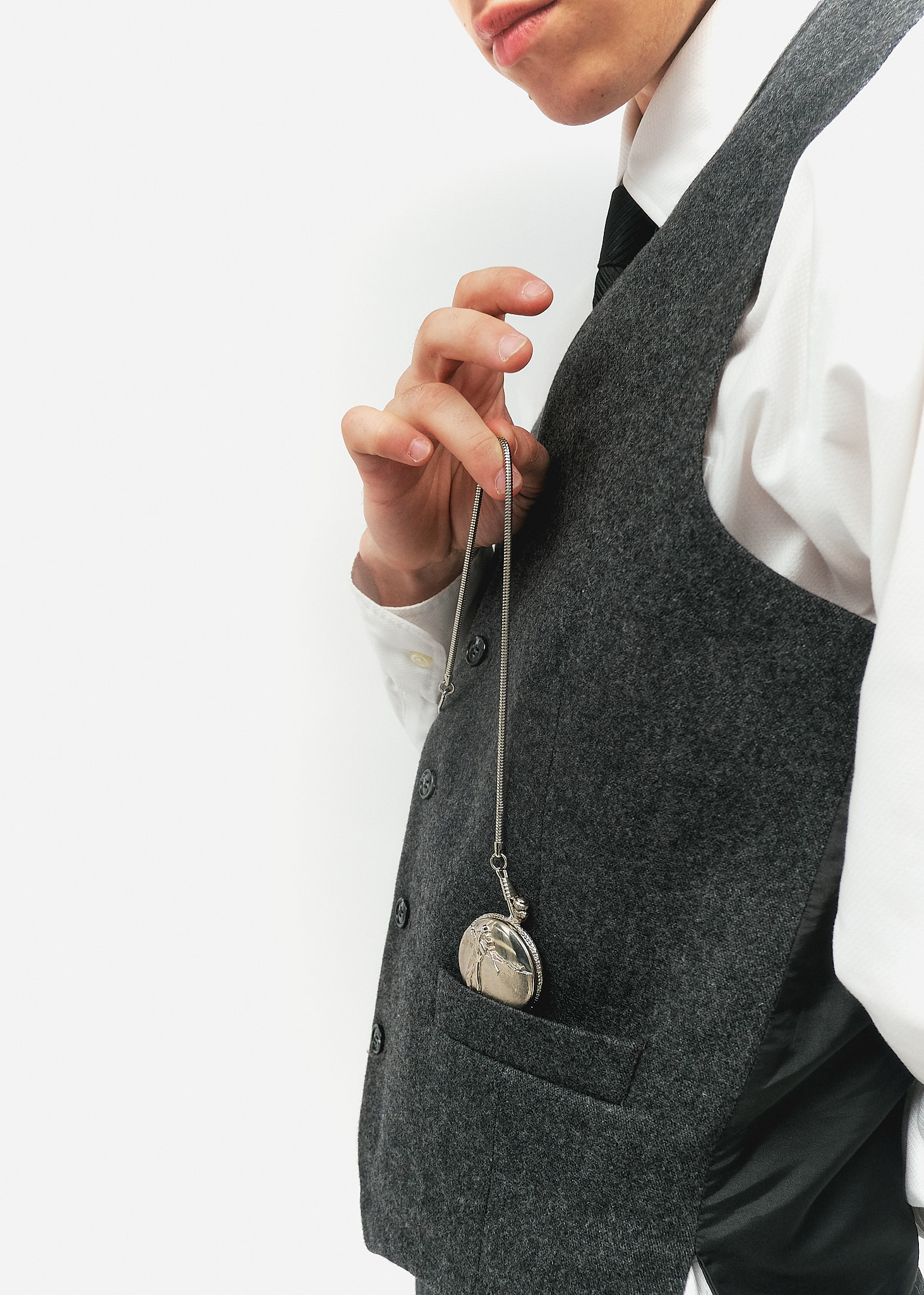 Аксесуар: Кишеньковий годинник на сріблястому ланцюжку, що кріпиться до жилета — ключовий елемент статусу та пунктуальності чоловіка 20-х років.