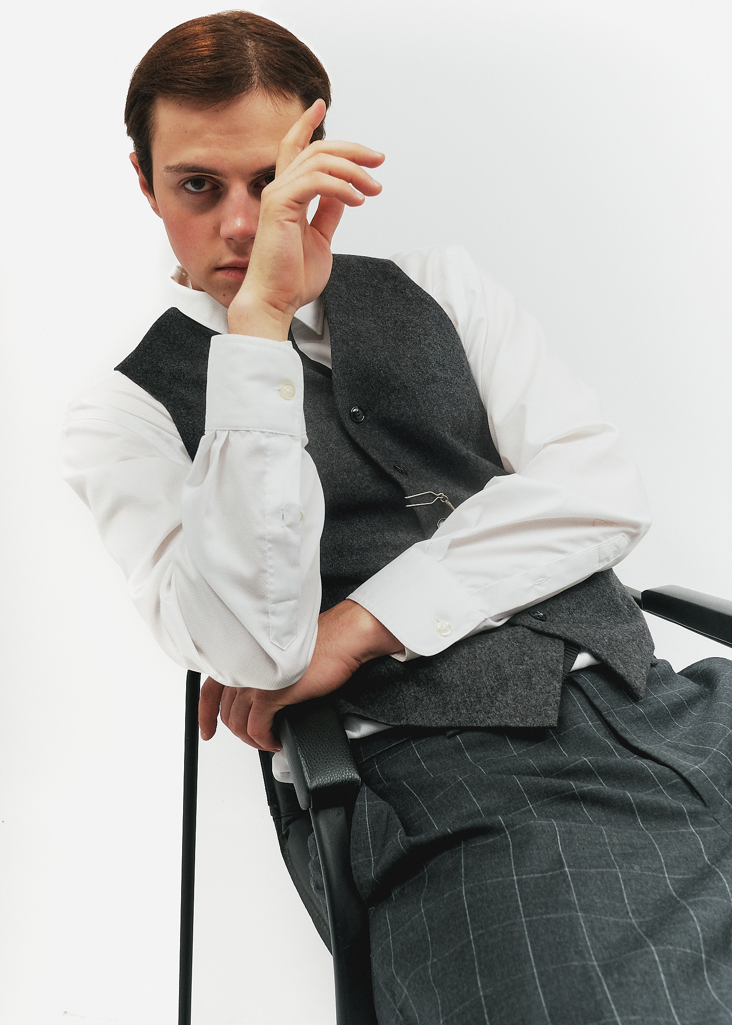Жилет: Класичний вовняний жилет темно-сірого (графітового) кольору з характерною грубою фактурою. Він має чотири гудзики та акуратні прорізні кишені, одна з яких призначена для годинника.