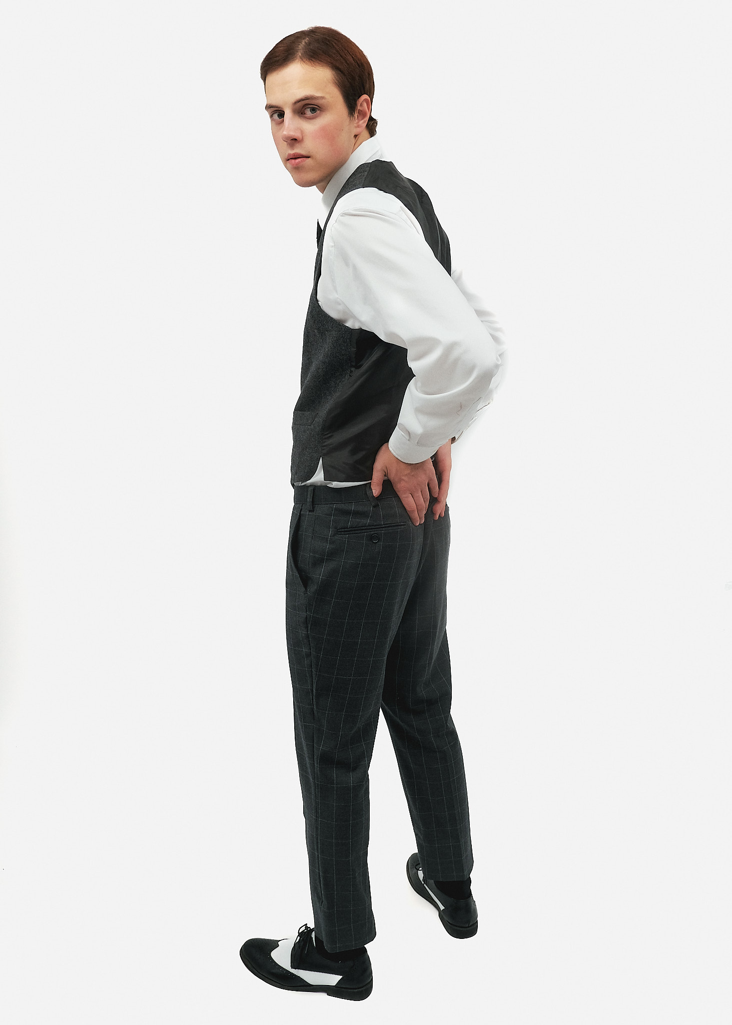 Штани: Сірі штани у велику світлу клітинку «віконна рама» (windowpane check) зі стрілками. Крій штанів вільний у стегнах і злегка звужений донизу, що відповідає моді того часу.