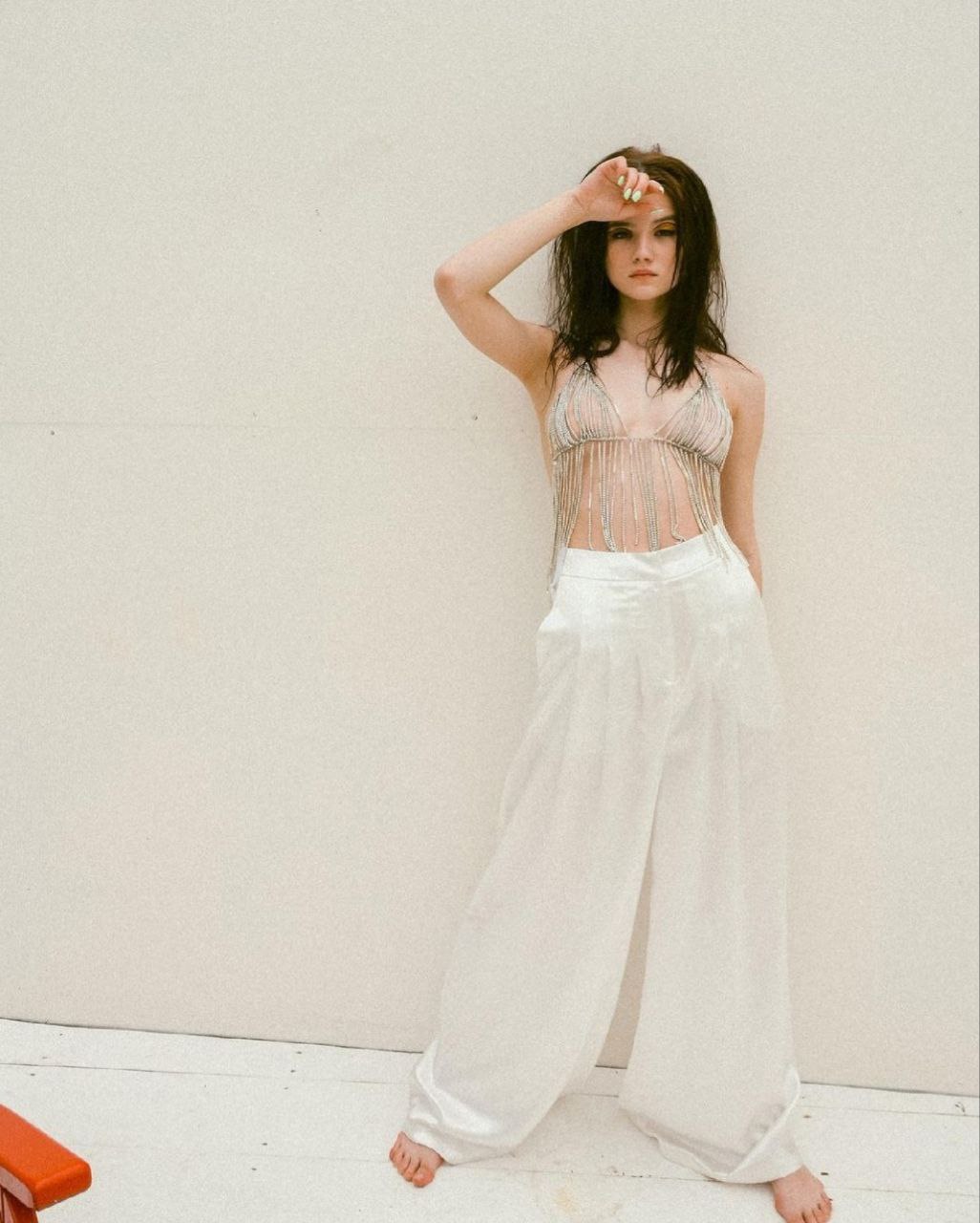Топ: Ексклюзивний кроп-топ, виконаний з каскадів сріблястих ланцюжків та страз. Тонкі бретелі та довга бахрома створюють ефектний «водоспад», який динамічно грає зі світлом при кожному русі.