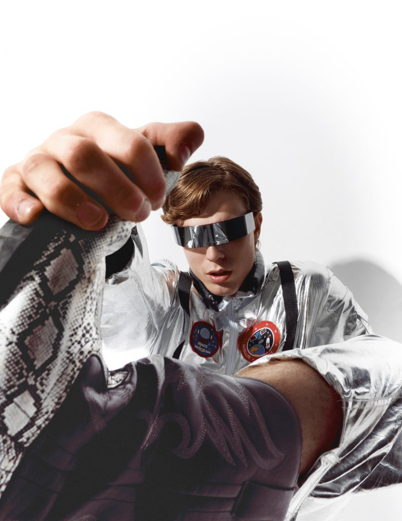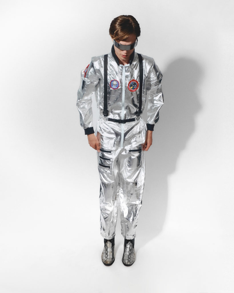 Ультимативний футуристичний образ, натхненний естетикою космічних польотів та срібного віку наукової фантастики. Це пряма відсилка до епохи підкорення космосу, де металізовані фактури символізують захист та прогрес. Образ поєднує в собі утилітарний крій комбінезона з іронічними деталями та ультрасучасними аксесуарами. Лук створений для тих, хто готовий стати першовідкривачем нових світів, зберігаючи при цьому бездоганний стиль та відданість High-Tech естетиці.
