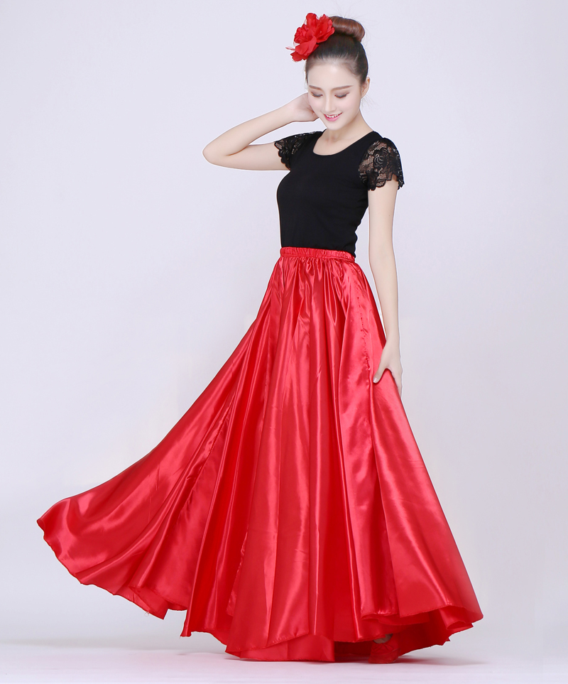 Спідниця: Довга спідниця-сонце насиченого червоного кольору з легким атласним блиском, що створює розкішний об'єм при русі.