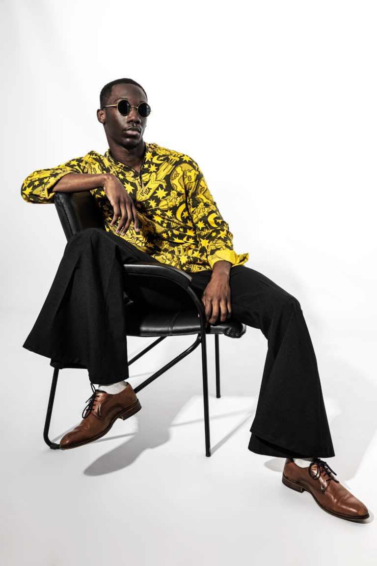 Сорочка: Жовта сорочка з довгим рукавом, прикрашена насиченим чорним графічним принтом у стилі коміксів або поп-арту з зірками та символікою. У 80-х такі яскраві патерни були надзвичайно популярними серед творчої молоді та представників музичної сцени.