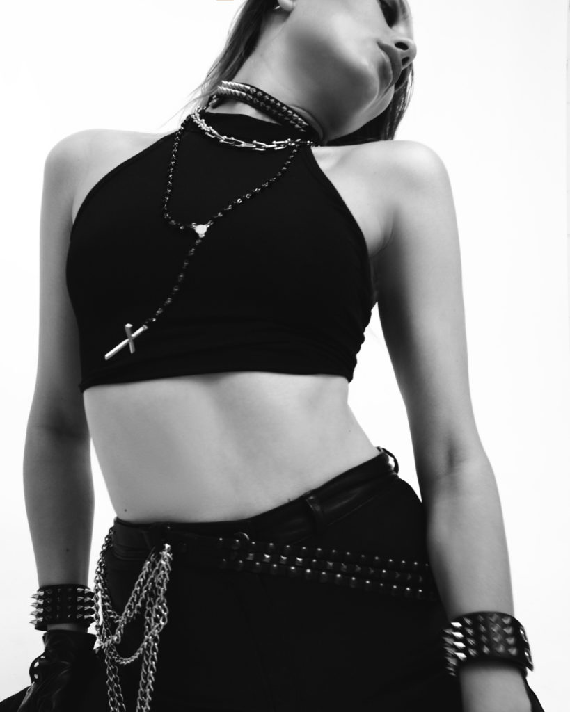 Багатошарові ланцюги: Довгі металеві ланцюги на шиї, що вільно спадають на груди, додаючи образу вертикальних ліній та динаміки.