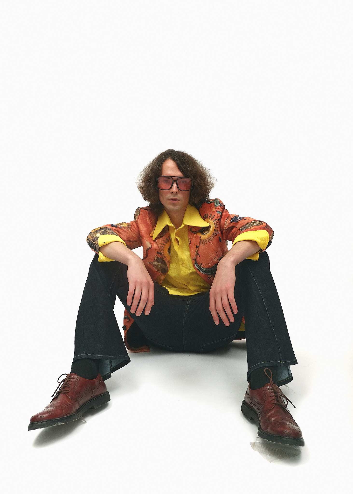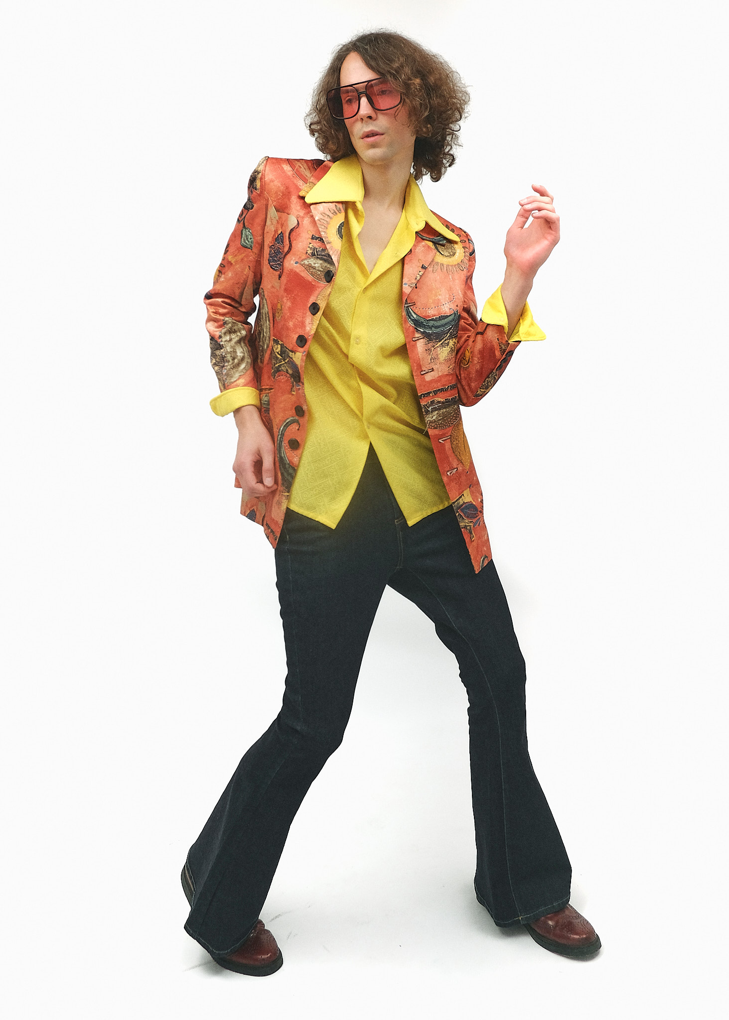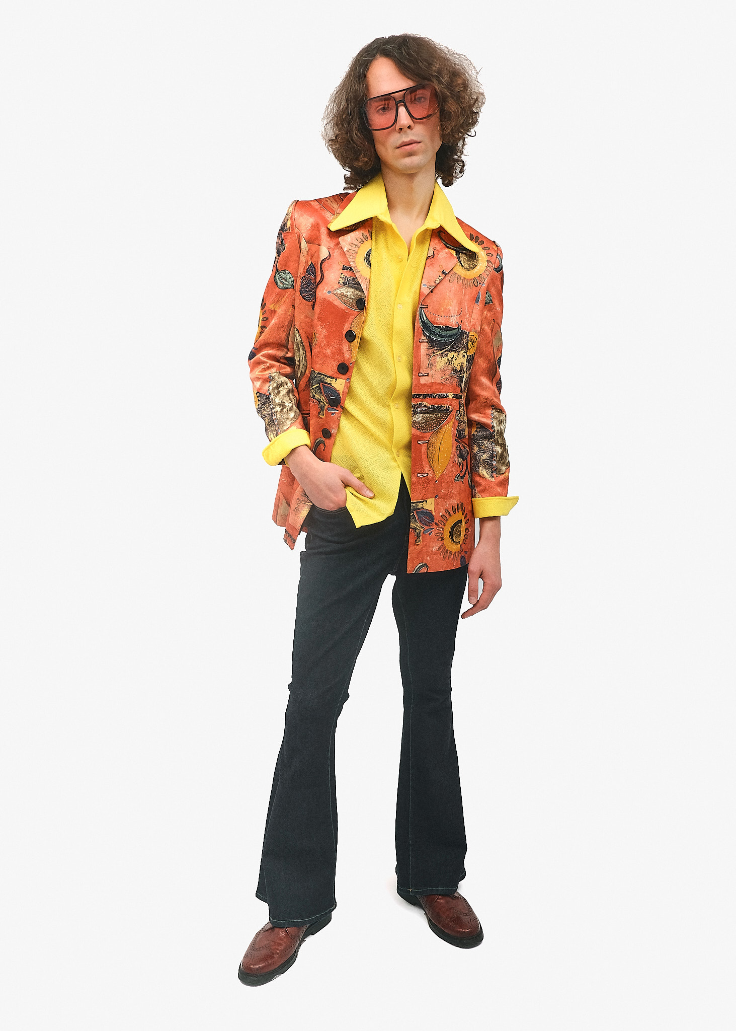 Сміливий та артистичний образ, що базується на поєднанні яскравих сонячних відтінків та складних візуальних принтів. Цей ансамбль демонструє перехід від психоделіки 70-х до більш структурованого та графічного стилю 80-х років, створюючи вигляд творчої особистості та інтелектуального гульвіси.