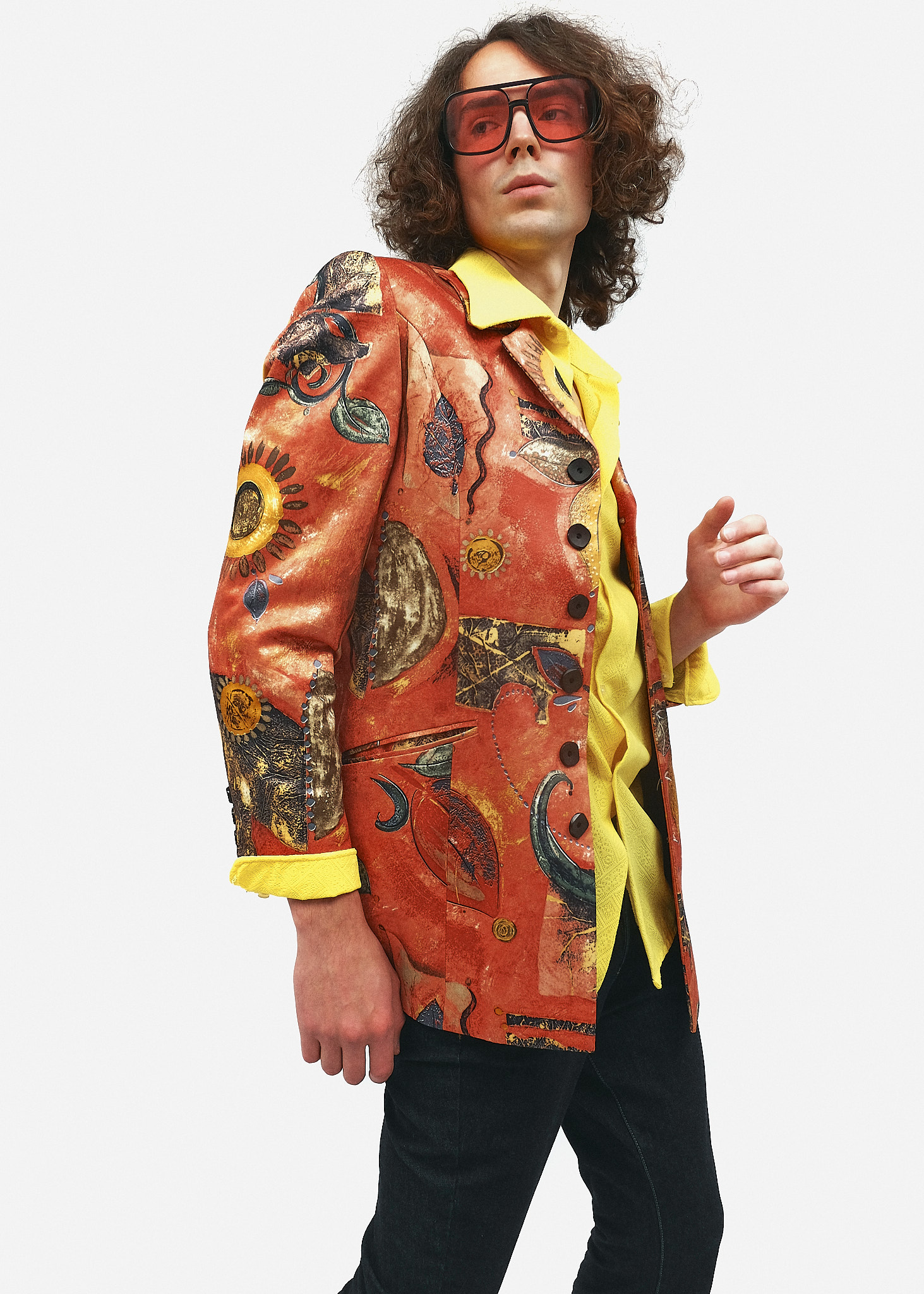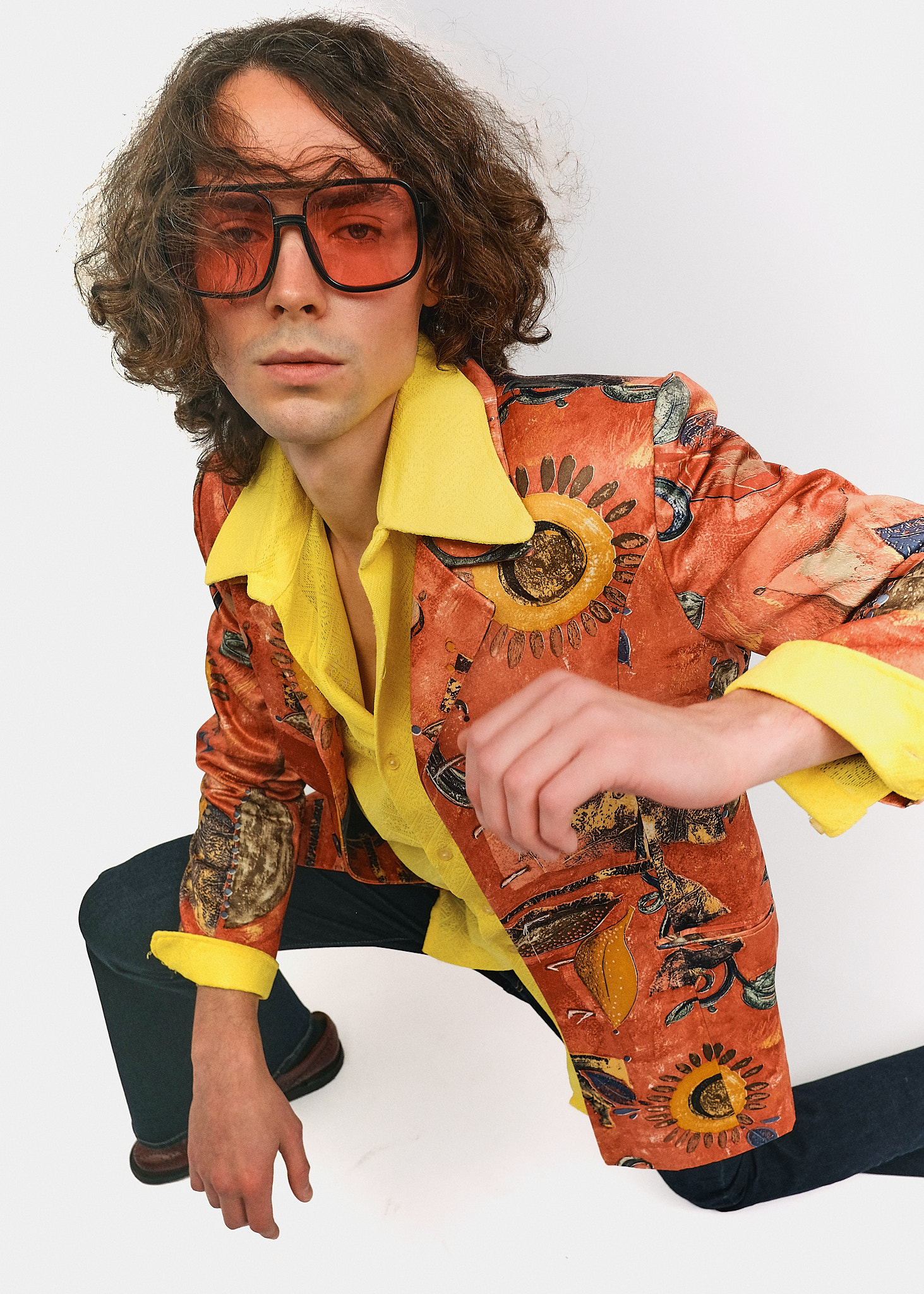 Яскраво-жовта сорочка: Модель із текстурованої тканини з великим гострим коміром, який виправлений поверх лацканів піджака для підкреслення ретро-силуету.
