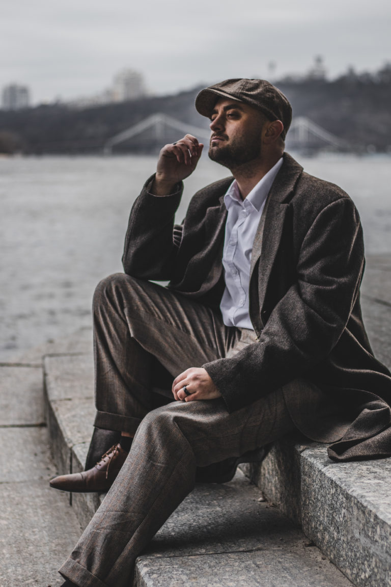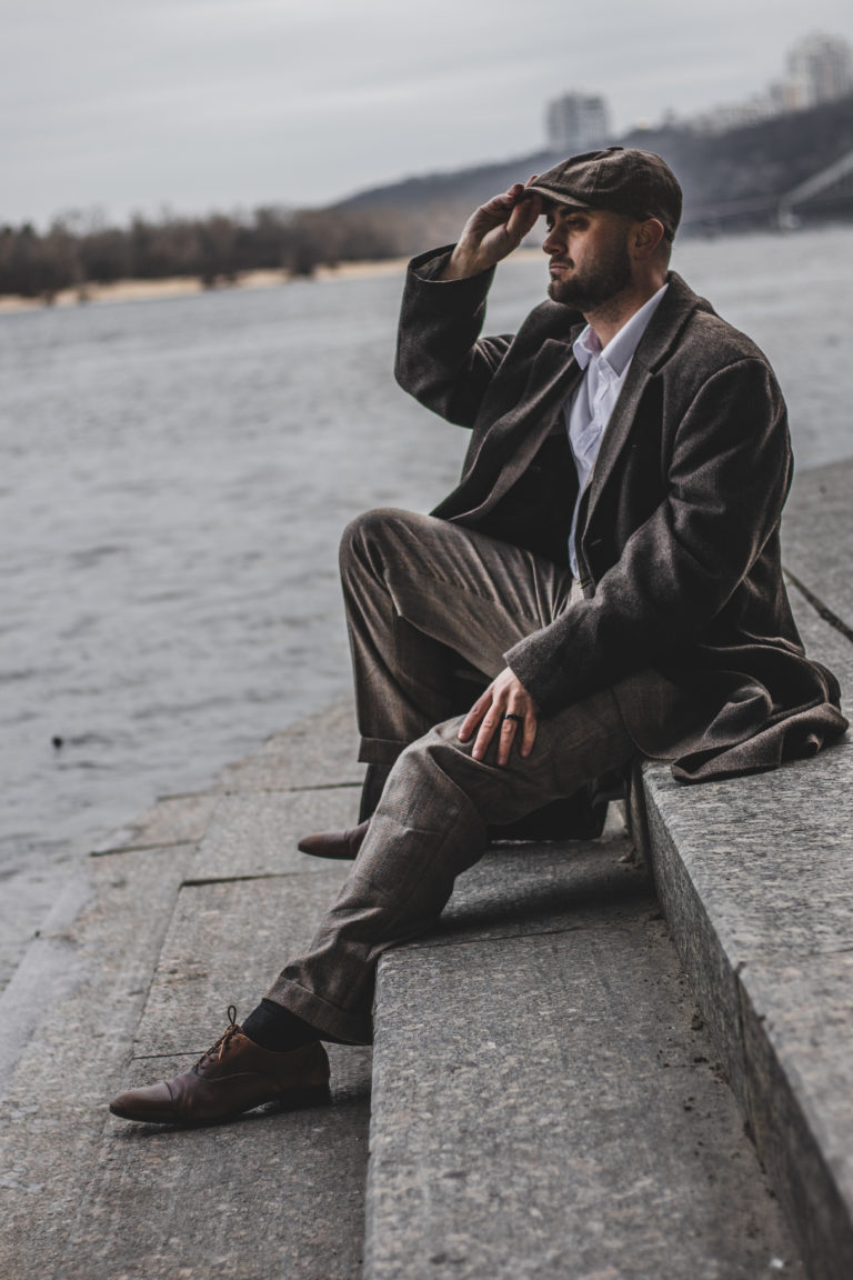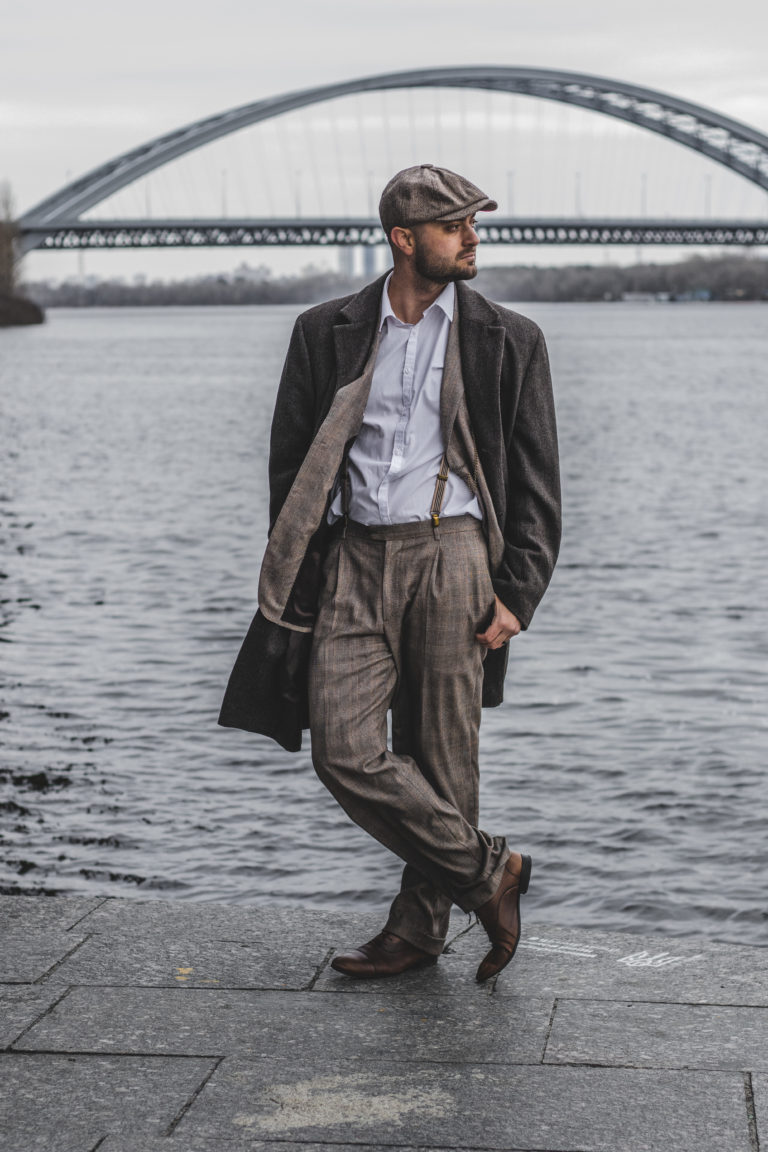 Головний убір: Традиційна восьмиклинка (кепка-газетяра) із сірого твіду, що є ключовим символом чоловічого гардероба тієї епохи.