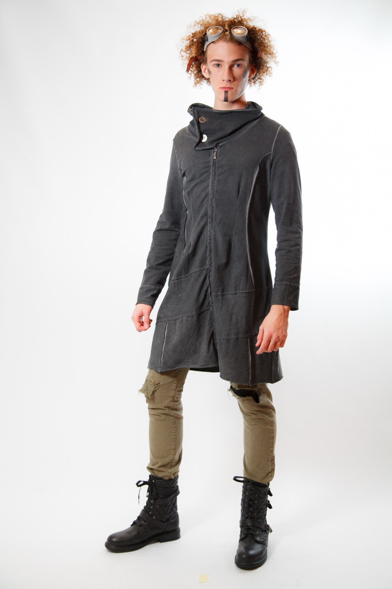 Подовжена накидка-кардиган: Вільний графітовий кардиган з відкритими зрізами та асиметричним кроєм. Він виконує роль легкого пильовика, додаючи силуету динаміки та багатошаровості.
