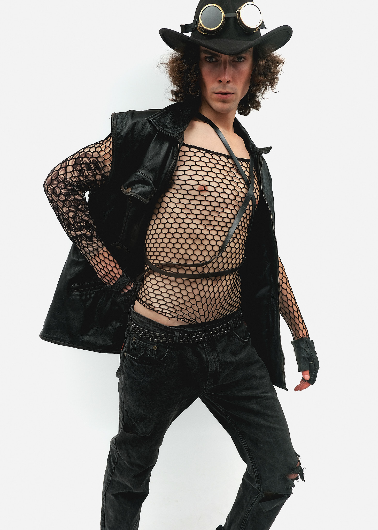 Сітчастий лонгслів: Основа верхньої частини — велика фігурна сітка (fishnet), що створює зухвалий контраст із важкою шкірою. На правому рукаві присутній додатковий декор, що імітує механічне або тату-покриття.