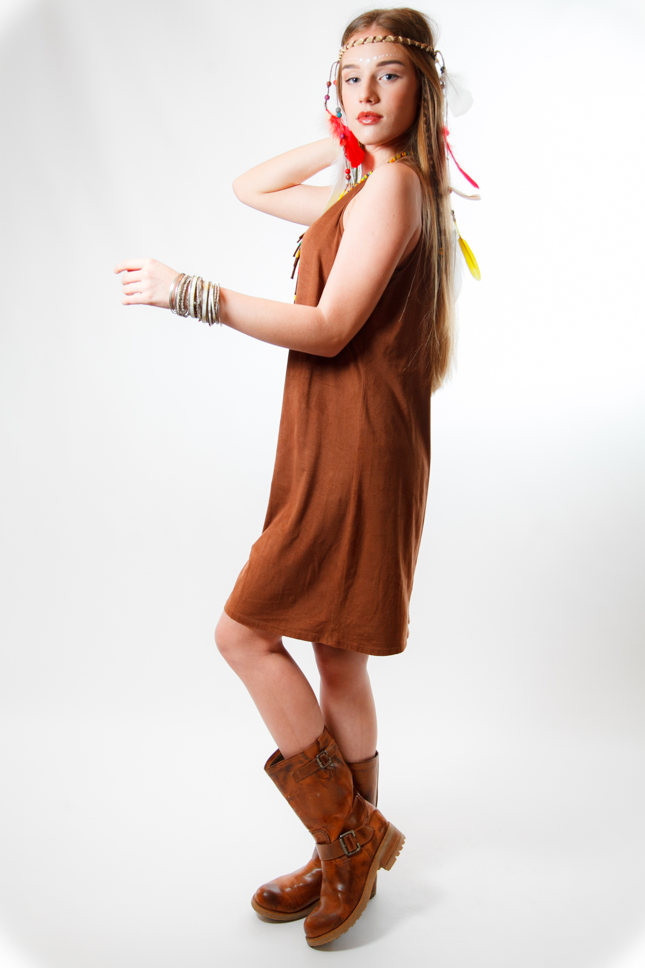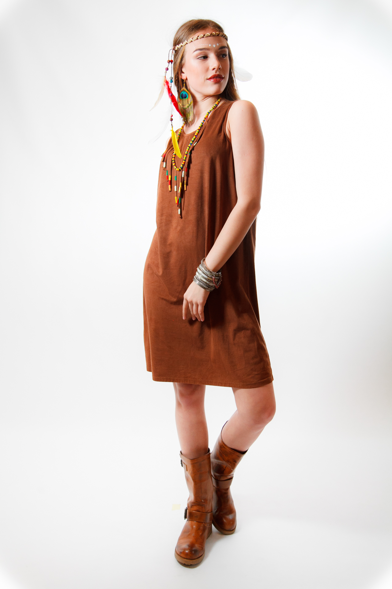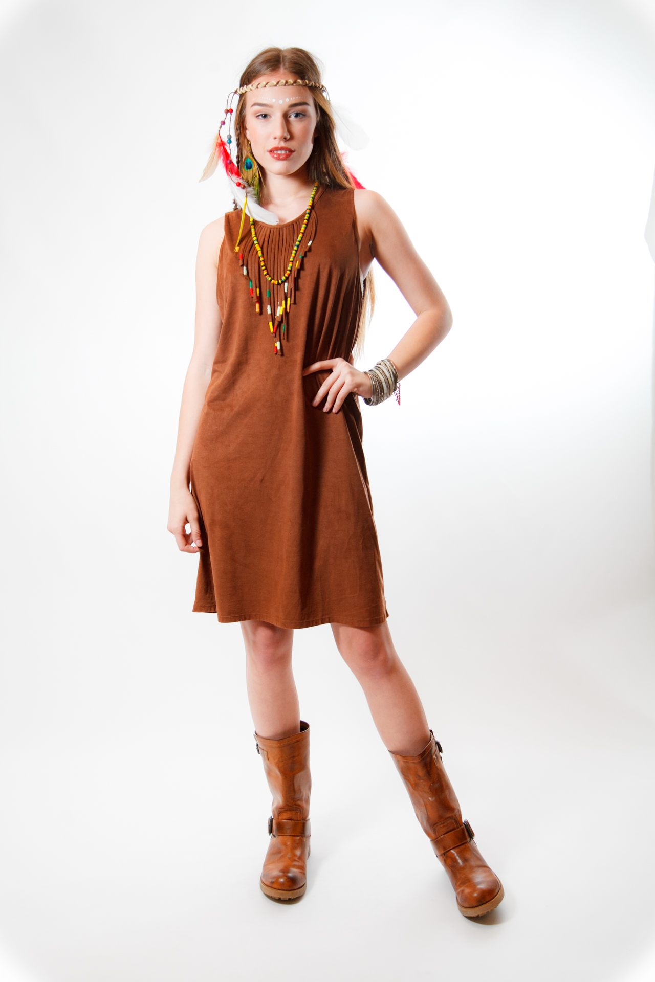 Стилізований етнічний образ, що поєднує в собі естетику корінних народів Америки та елементи кантрі. Лаконічний крій сукні компенсується великою кількістю дрібних деталей та автентичних текстур, що створює образ сміливої та вільної мандрівниці.