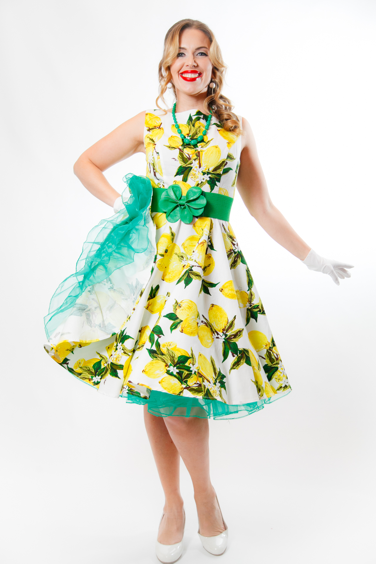 Сукня: Біла сукня силуету "A-line" без рукавів, прикрашена великим реалістичним принтом лимонів та зеленого листя. Пишна спідниця доповнена смарагдовим фатиновим під'юбником, що створює кокетливий об'єм.