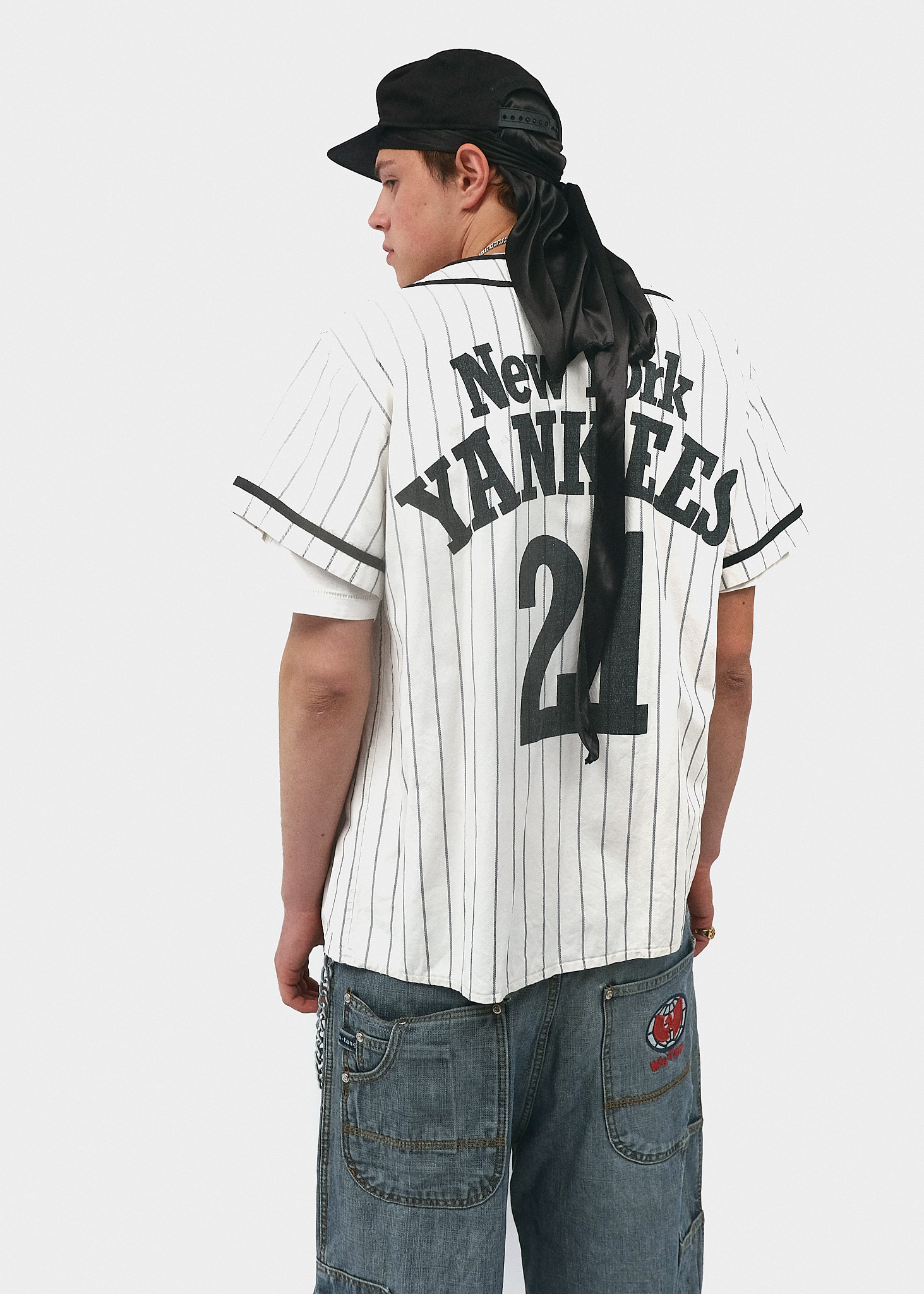 Верхній одяг: Вільна біла сорочка в тонку чорну вертикальну смужку, стилізована під бейсбольну джерсі, одягнена розстебнутою поверх футболки.