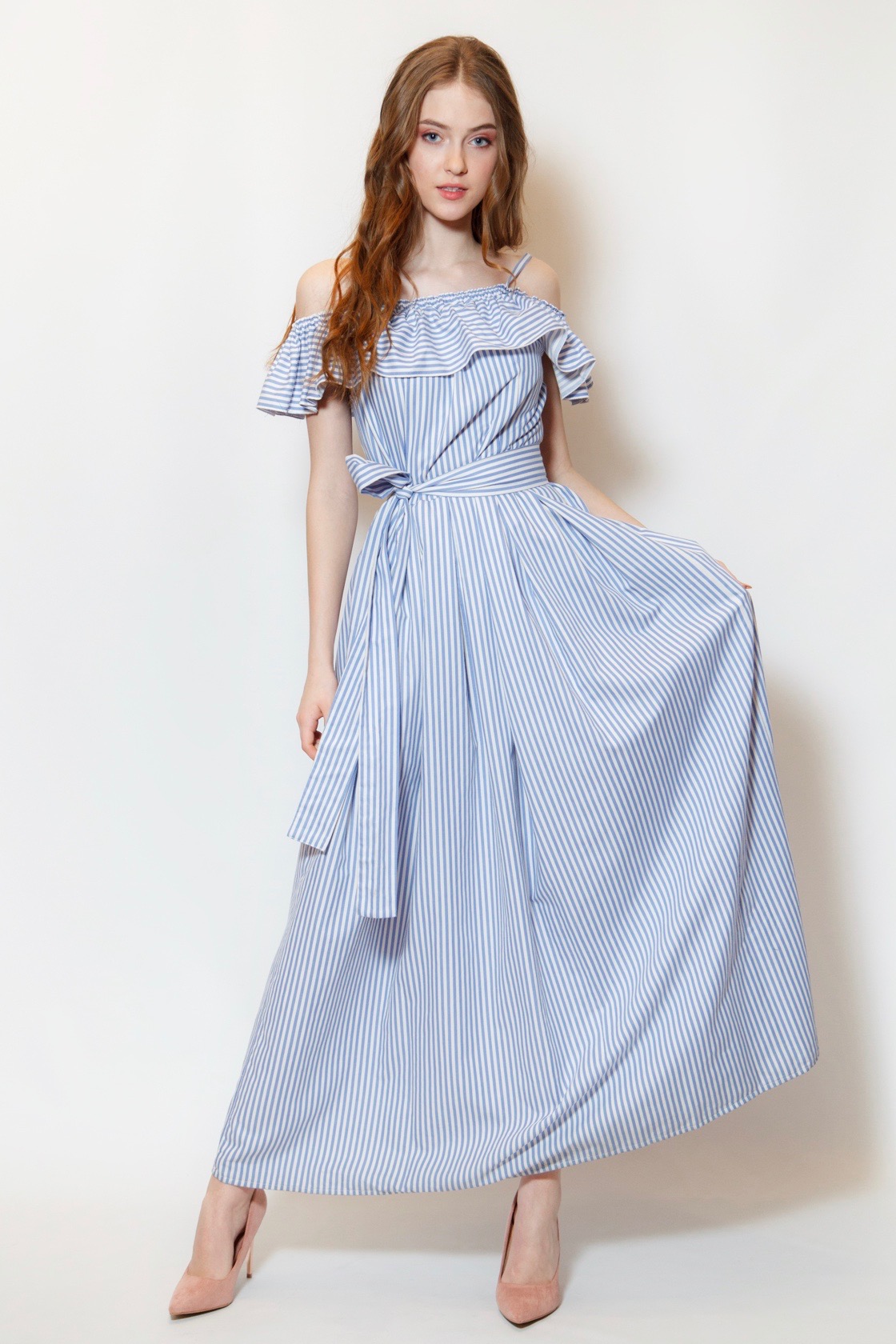 Сукня макси з відкритими плечима: Модель довжиною в підлогу з еластичною лінією декольте, прикрашеною м'яким воланом. Такий крій підкреслює тендітність плечей і додає образу романтичного настрою.