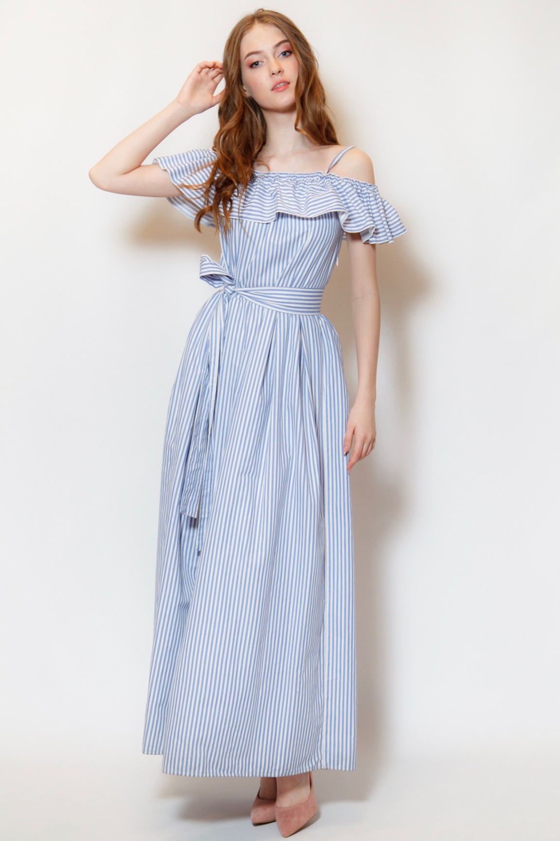 Втілення літньої свіжості та вишуканої простоти. Цей вечірній одяг у стилі «середземноморський шик» ідеально підходить для літніх вечірок на терасі, прогулянок на яхті або романтичних вечерь на узбережжі. Поєднання класичної тонкої смужки та жіночного фасону з відкритими плечима створює легкий, майже невагомий образ, що випромінює спокій та елегантність.