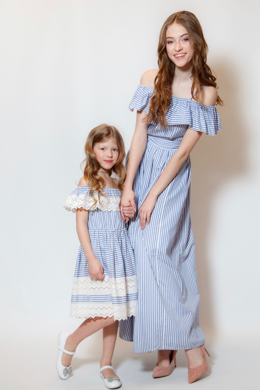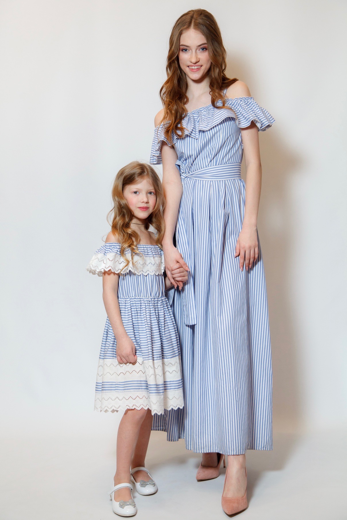 Текстильний принт у блакитну смужку: Вертикальний візерунок на бавовняній основі візуально витягує силует, надаючи йому стрункості та особливого шарму традиційної літньої класики.