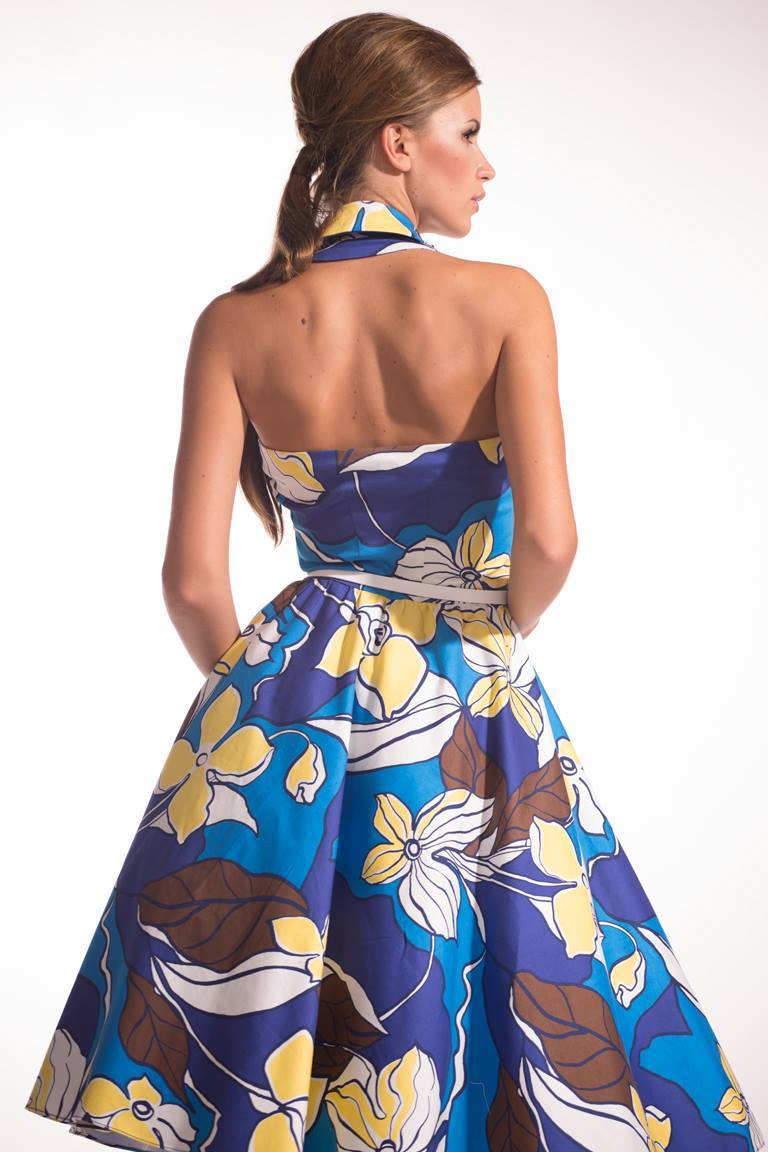 Яскравий та самобутній вечірній одяг, що переносить естетику 50-х років у контекст сучасного курортного шику. Насичений синій колір у поєднанні з великим квітковим орнаментом створює життєрадісний та водночас елегантний образ. Ця сукня стане ідеальним вибором для літніх святкувань на терасі, вечірніх прогулянок або тематичних заходів у стилі ретро-романтики.