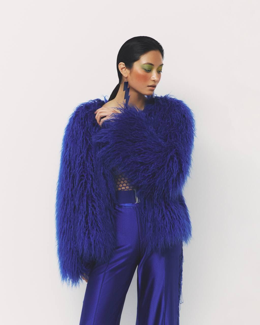 Сукня: Повітряна мінісукня з невагомої напівпрозорої тканини ніжного лавандового відтінку. Виріб прикрашений авторським принтом із зображенням сонця та небесних світил, що додає образу містичного підтексту. Пишні рукави-ліхтарики та вільний крій створюють об’ємний та водночас легкий силует.